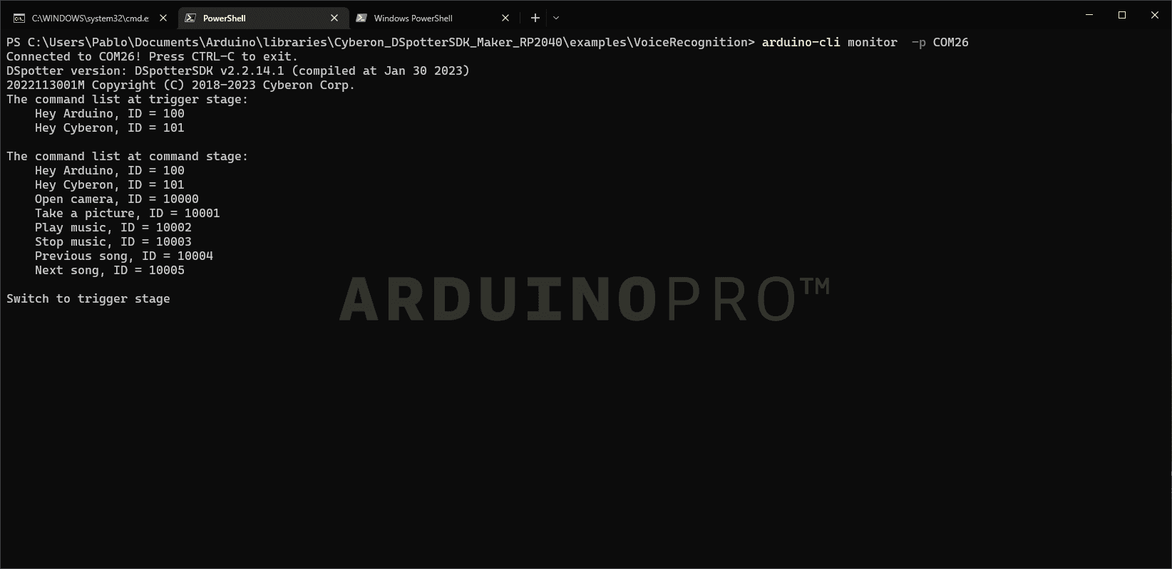 You can now open the Serial Monitor where you can see the available commands that the CyberonSDK recognizes.