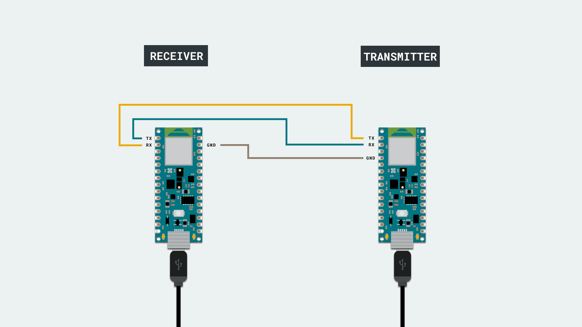 At the moment of making the connections, we need to remember that this protocol has two dedicated lines TX and RX so we need to make sure to connect the TX pin, of one of the boards, with the RX of the other one. The same goes for the second, where his TX pin need to be connected to the RX pin of the first board.