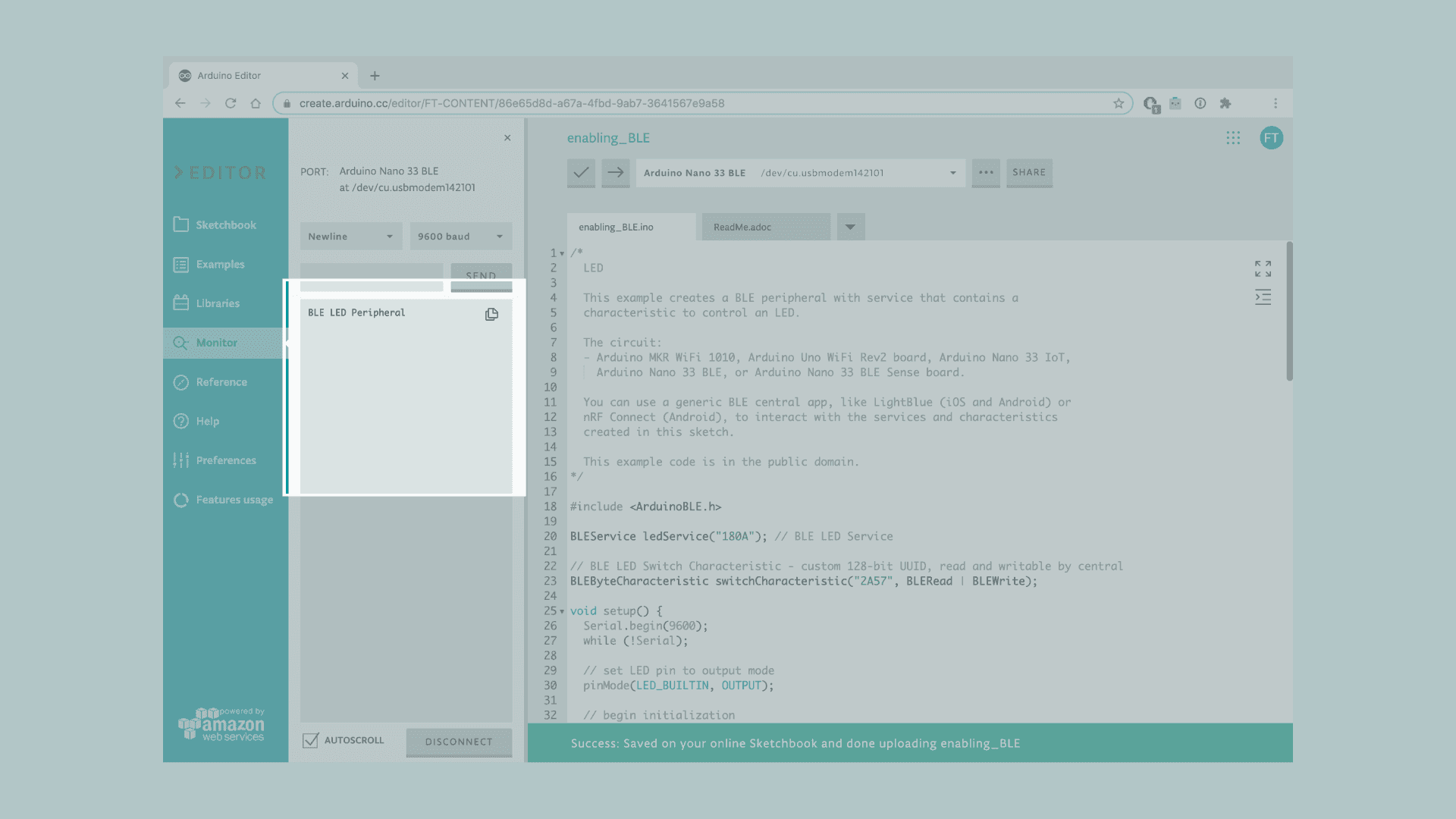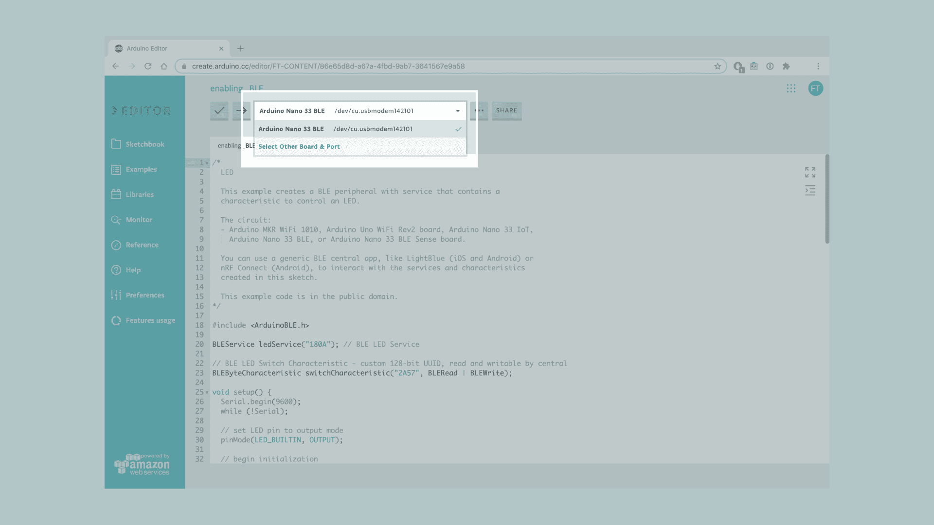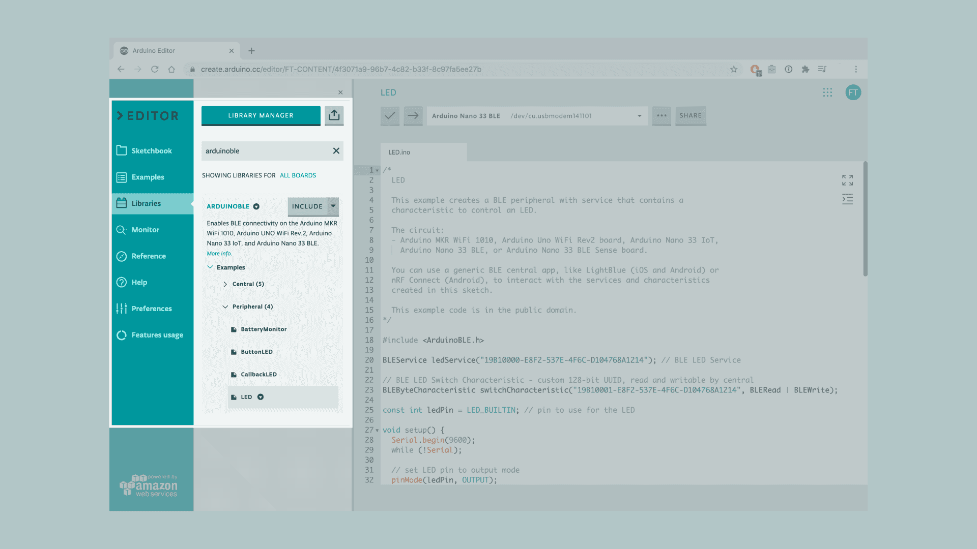 Let's start by opening the Arduino Web Editor, click on the Libraries tab and search for the ArduinoBLE library. Then in > Examples > Peripheral, open the LED sketch and once it opens, you could rename it as desired.