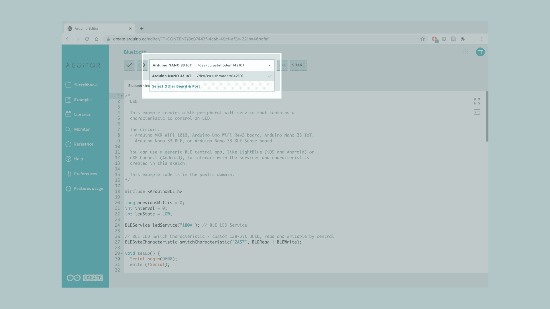 setup() function, we need to go to the BLE.setLocalName() and change the name to "Nano 33 IoT" in order to identify the board we are using.1// set advertised local name and service UUID:2 BLE.setLocalName("Nano 33 IoT");3 BLE.setAdvertisedService(ledService);Now, in the