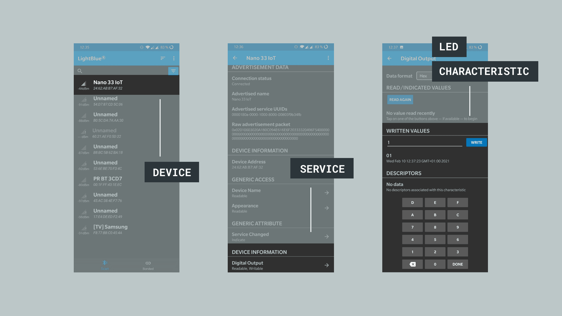 To control the LED, we simply need to write 1,2 or 3 in the "WRITTEN VALUES" field to turn on the LED, make the LED blink fast or slow and any other value to turn them off. This is within the "Digital Output" characteristic, which is located under "Device Information".