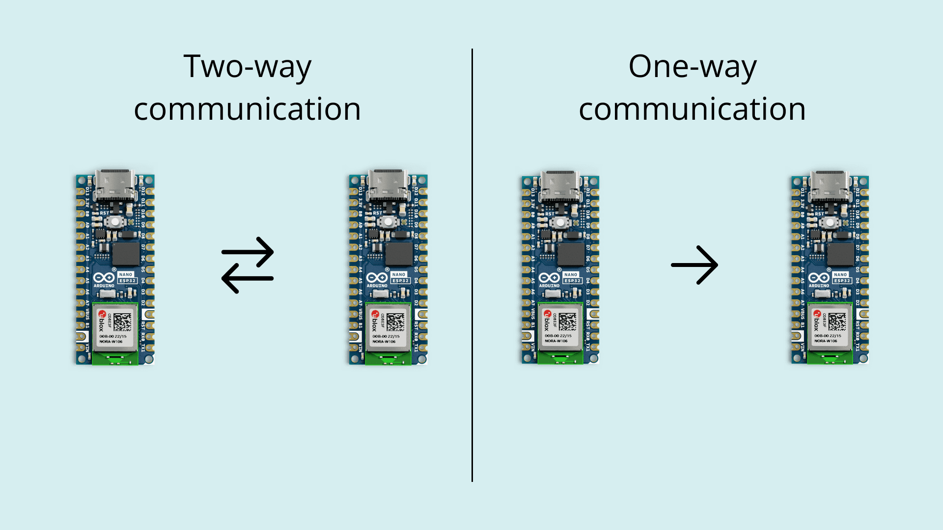 Two-way communication: In two-way communication mode, both devices can exchange data bidirectionally. This mode enables a back-and-forth exchange of information between the devices, allowing for more interactive and responsive communication. It's suitable for applications where devices need to send and receive data from each other, such as remote control systems or interactive IoT devices.