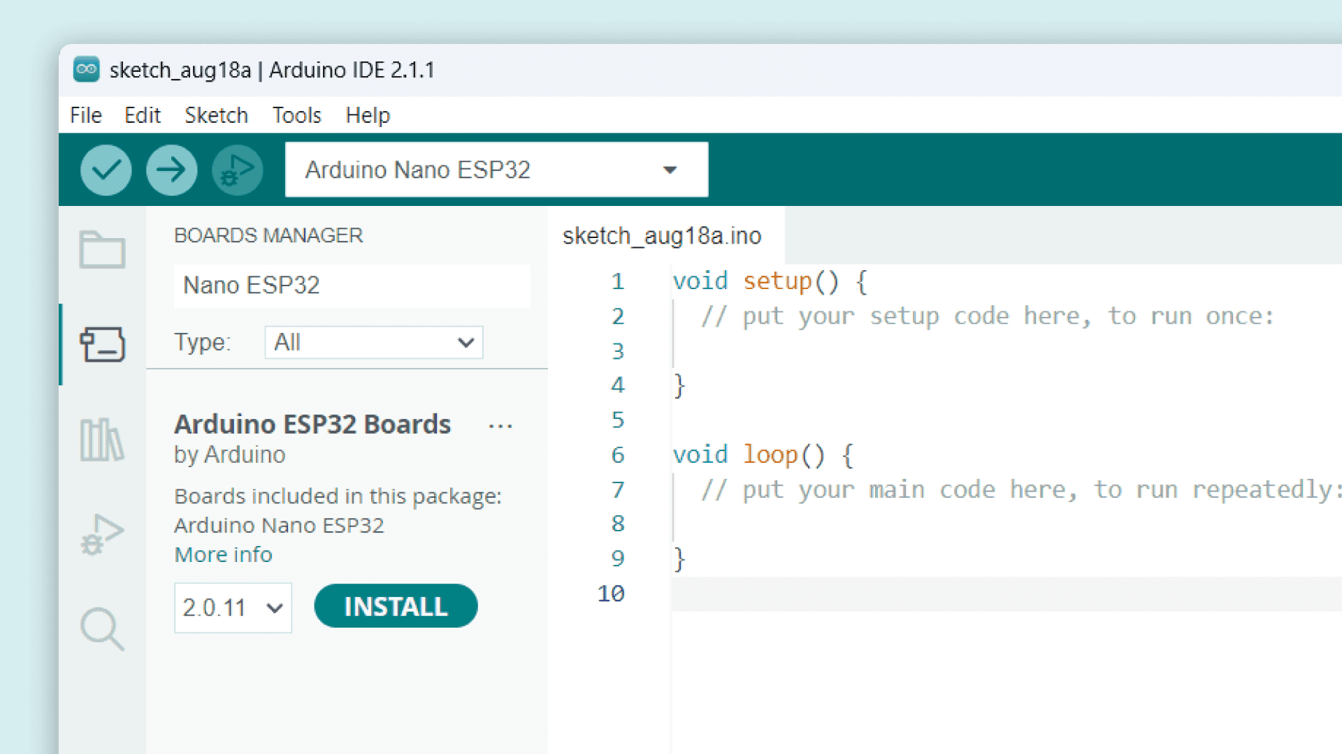 To install the board package, open the "Board Manager" from the menu to the left. Search for Nano ESP32 and install the latest version (or the version you want to use).