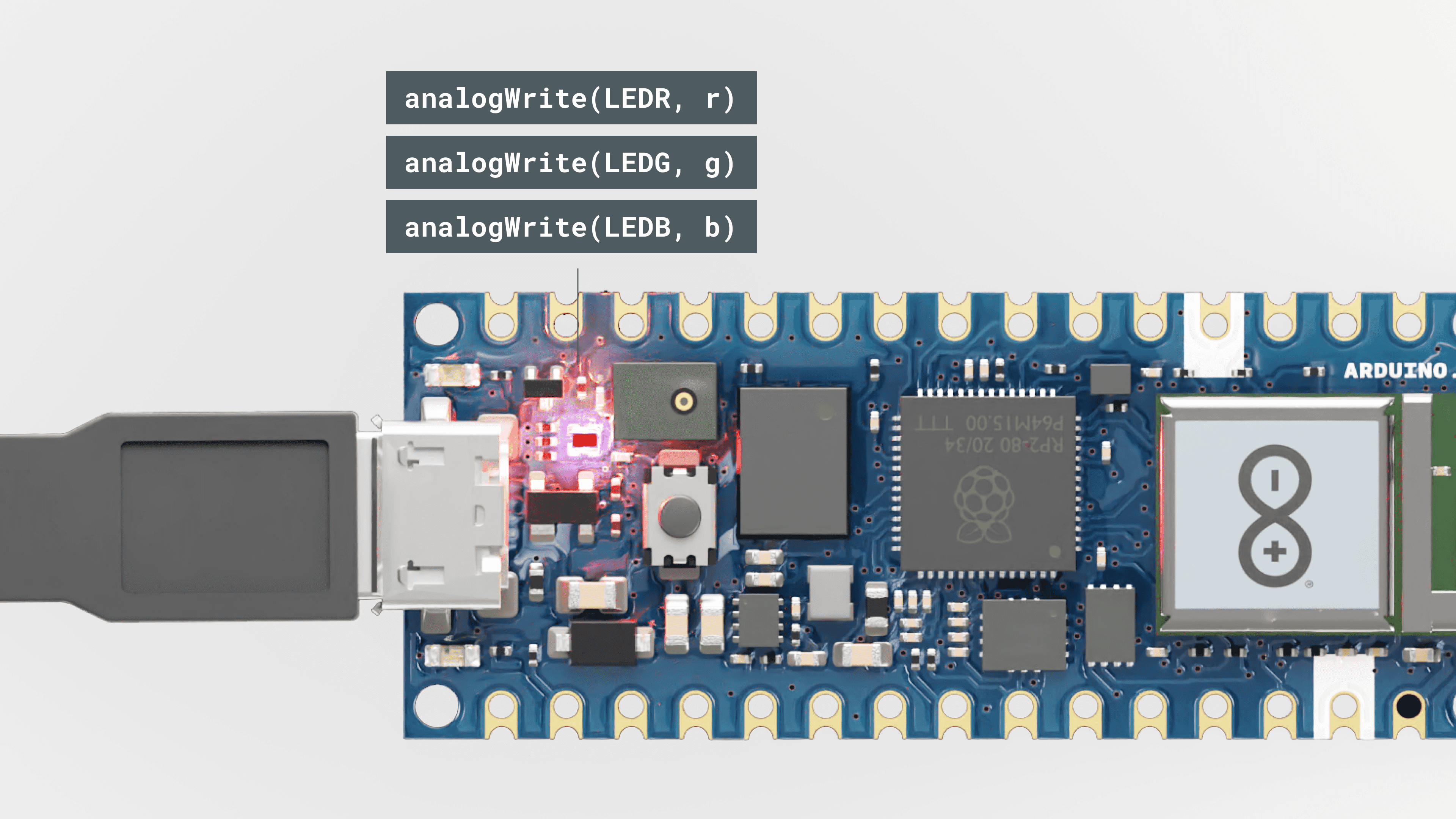 49 //values on Nano RP2040 Connect are inverted50 //so let's remap them51 int red = map(r, 0, 255, 255, 0);52 int green = map(g, 0, 255, 255, 0);53 int blue = map(b, 0, 255, 255, 0);54