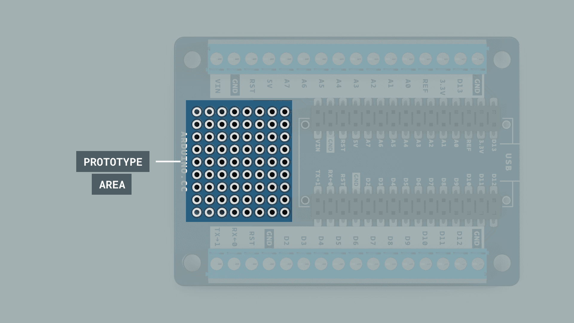 The prototyping area is 9x8, with a pitch of 2.54 mm. While not huge, it is perfect for mounting smaller circuits ICs, sensors or other components.