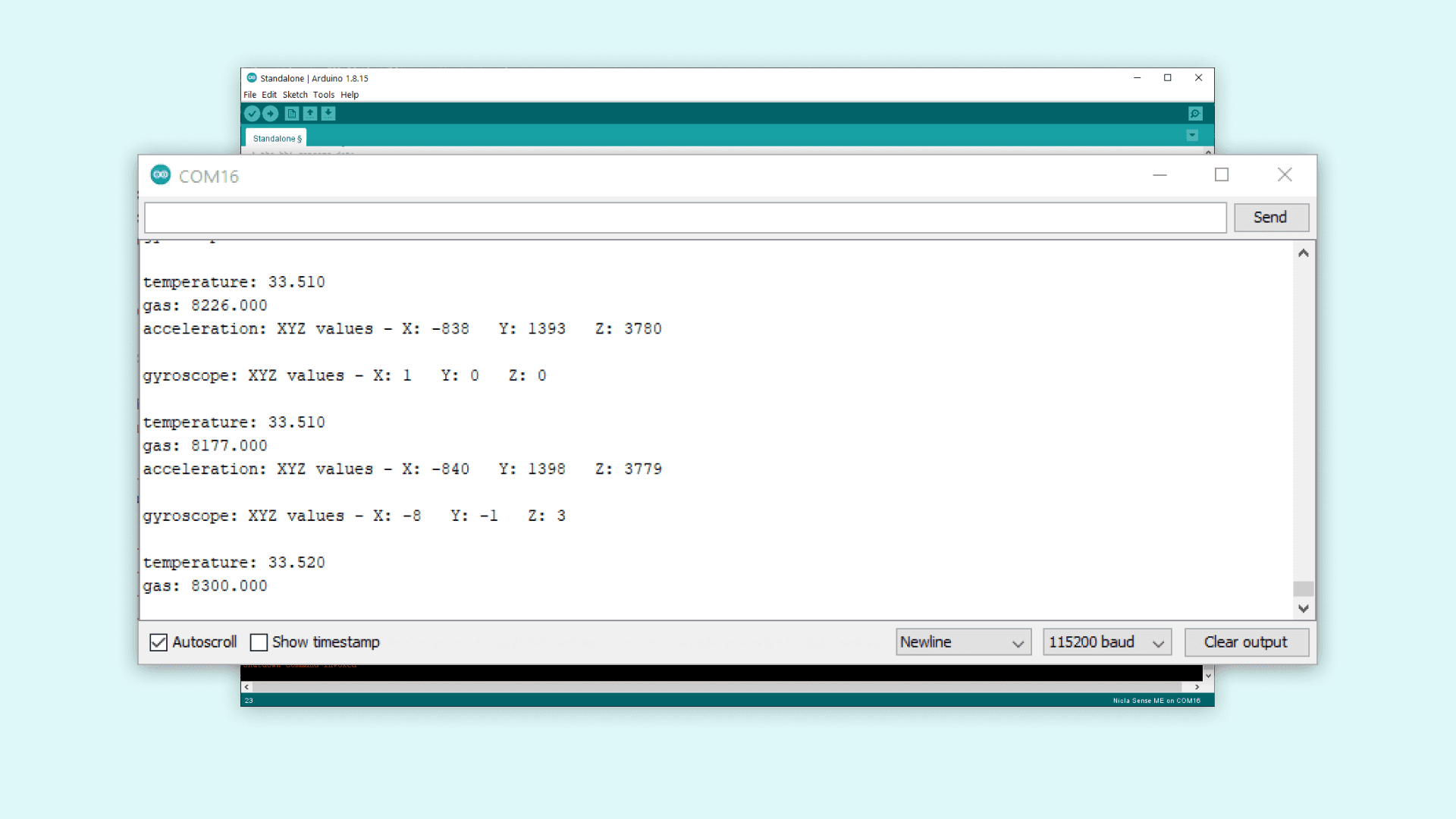 1Serial.println(String("acceleration: ") + accel.toString());2 Serial.println(String("gyroscope: ") + gyro.toString());3 Serial.println(String("temperature: ") + String(temp.value(),3));4 Serial.println(String("gas: ") + String(gas.value(),3));Running the Sketch