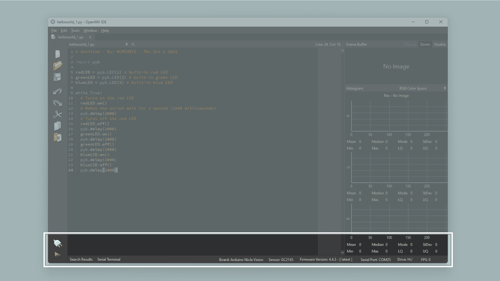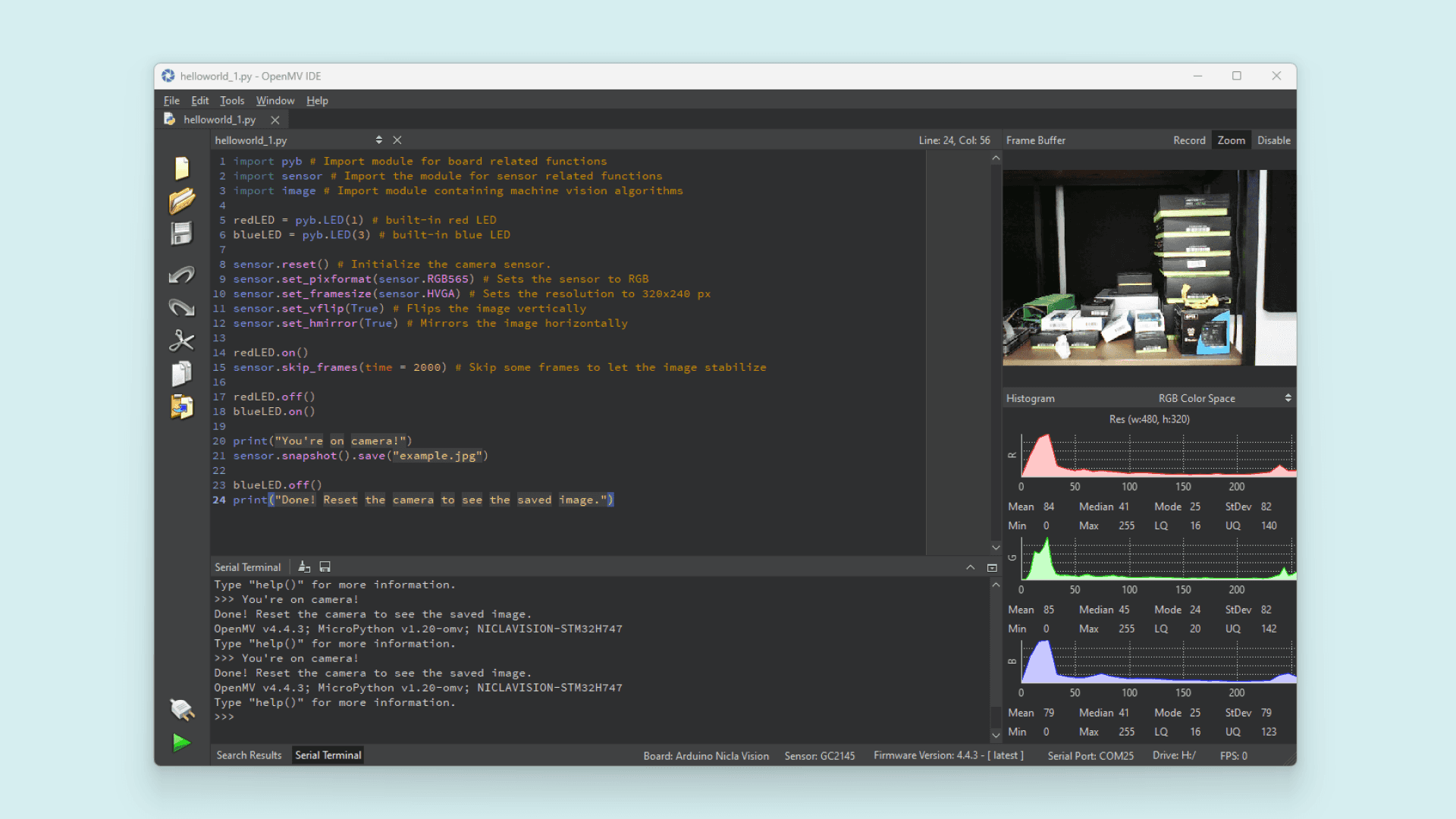 In this tutorial you learned how to use the OpenMV IDE with your Nicla Vision board. You also learned how to control the Nicla Vision's RGB LED with MicroPython functions and to upload the script to your board using the OpenMV IDE.
