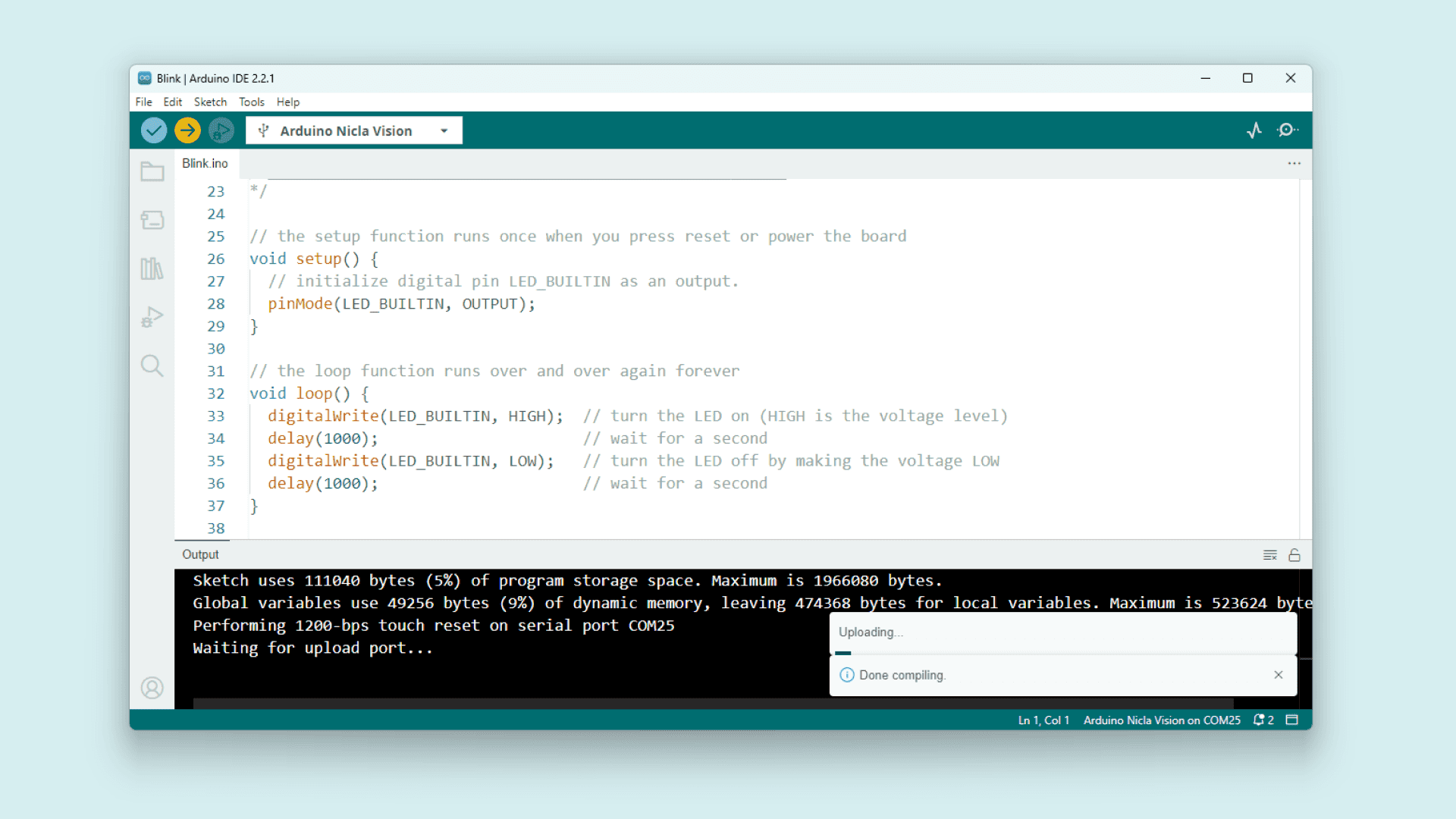 Now, the built-in LED on your Nicla Vision board should be blinking red, green and then blue repeatedly.