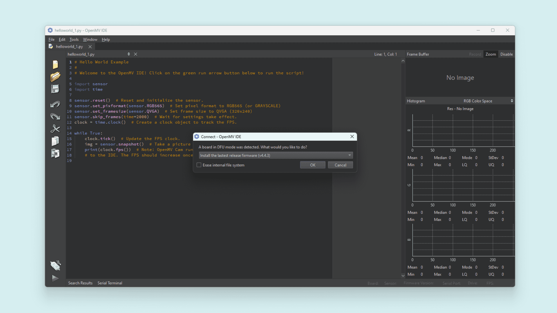 Install the latest release firmware. This will install the latest OpenMV firmware on the Nicla Vision. You can leave the option of erasing the internal file system unselected and click OK.