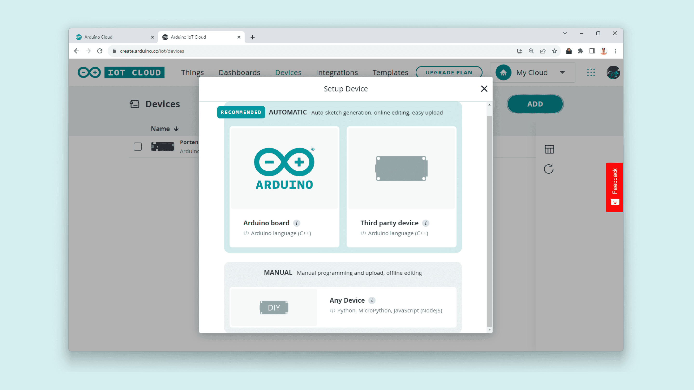 First, provision your Nicla Vision on your Arduino Cloud space. To do this, navigate to Devices and then click on the ADD button: