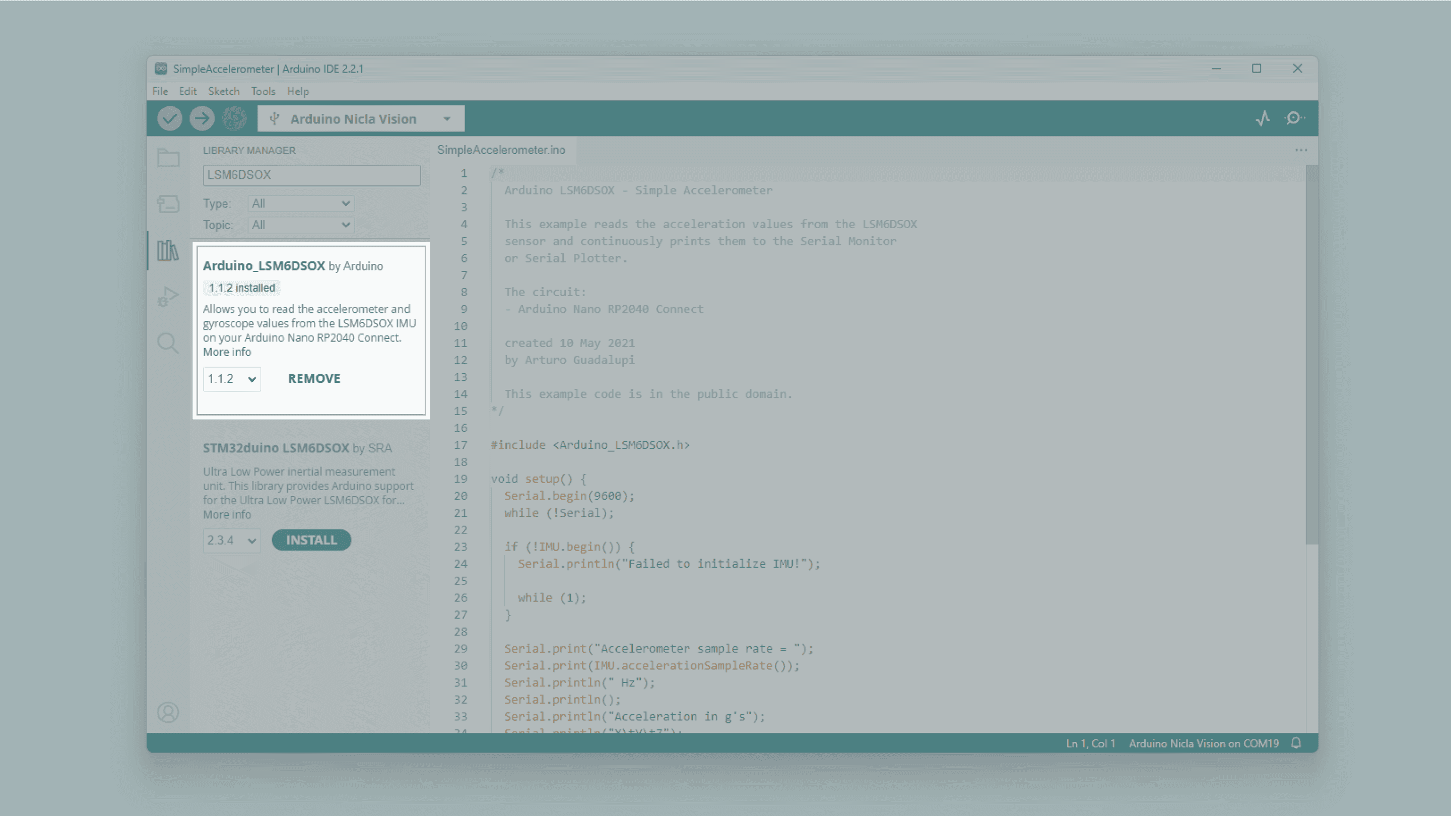 28}To upload the code to the Nicla Vision, click the Verify button to compile the sketch and check for errors; then click the Upload button to program the board with the sketch.
