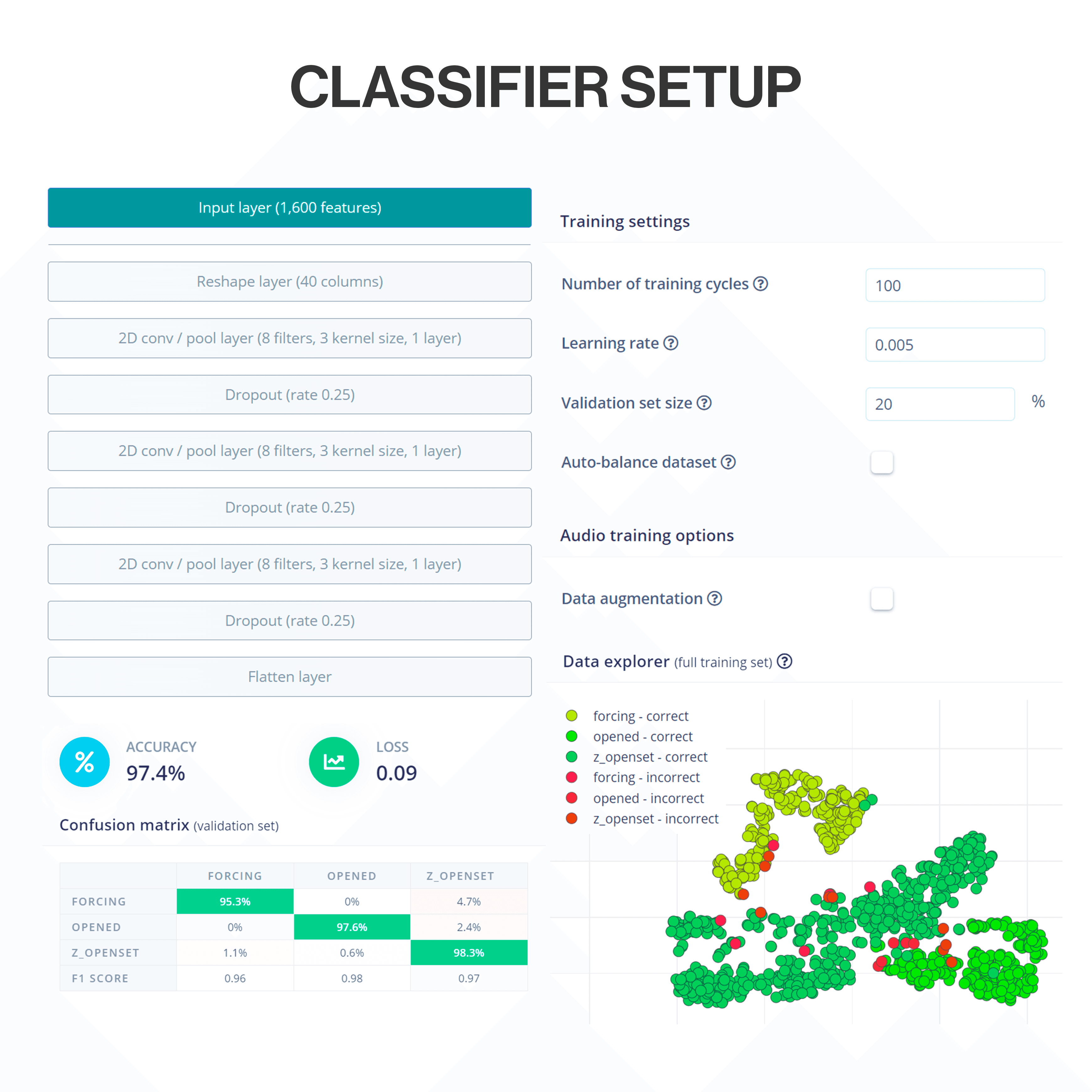 After the model is trained with a lot of samples of a door being opened, being forced and nothing happening (z_openset), we got considerable good results that we can evidentiate on the "Confusion matrix" with a 97.4% of accuracy being achieved with a validation set of new data.