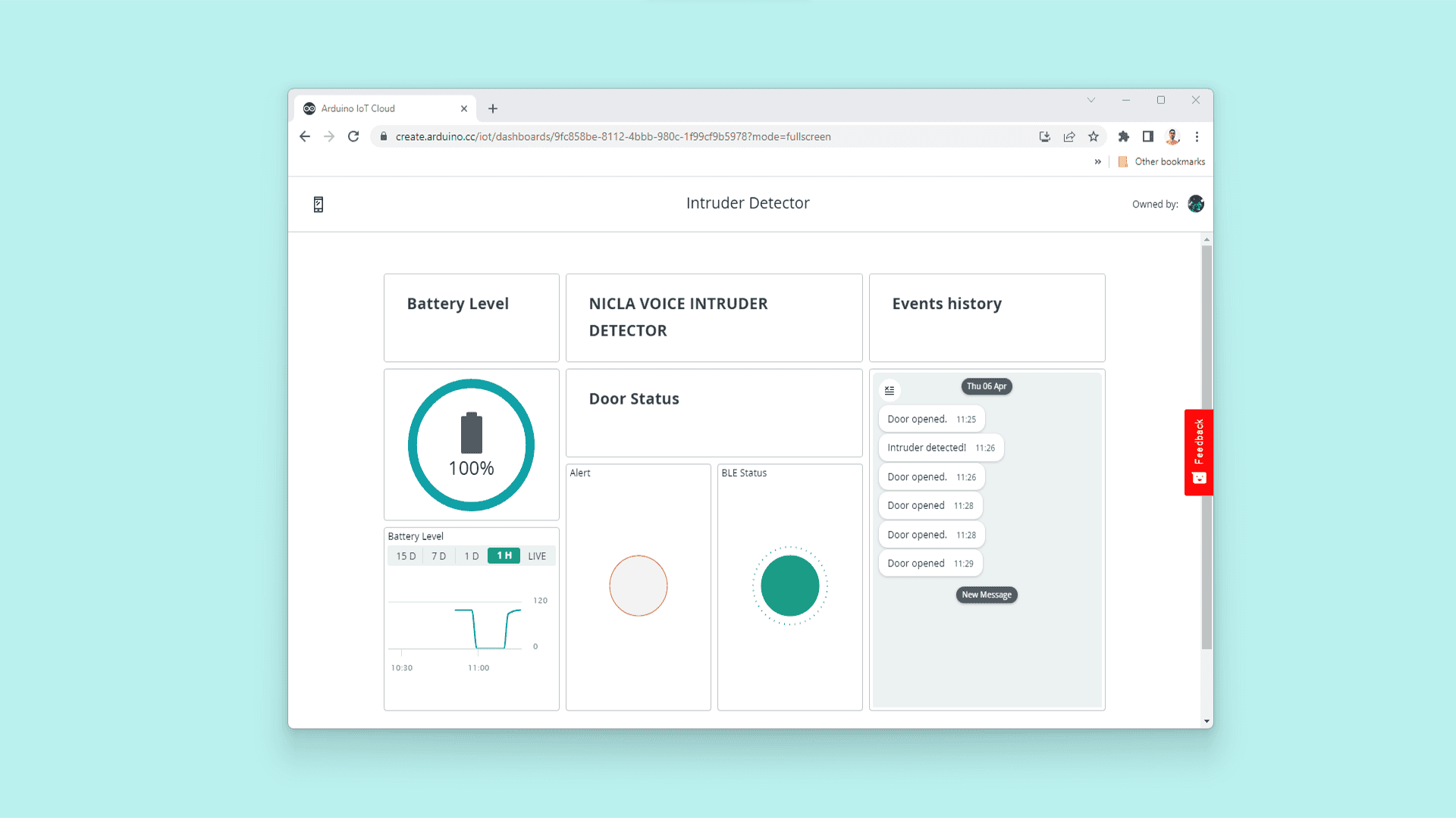 Within the Arduino Cloud's dashboard, the system variables can be monitored. We have a battery level indicator widget accompanied by a time series graph, a chat-looking widget to store the events historically, a red LED to shine when an intruder is detected by the system, and a green LED to show the Bluetooth® Low Energy connection status between the Nicla Voice and the Portenta H7 host.