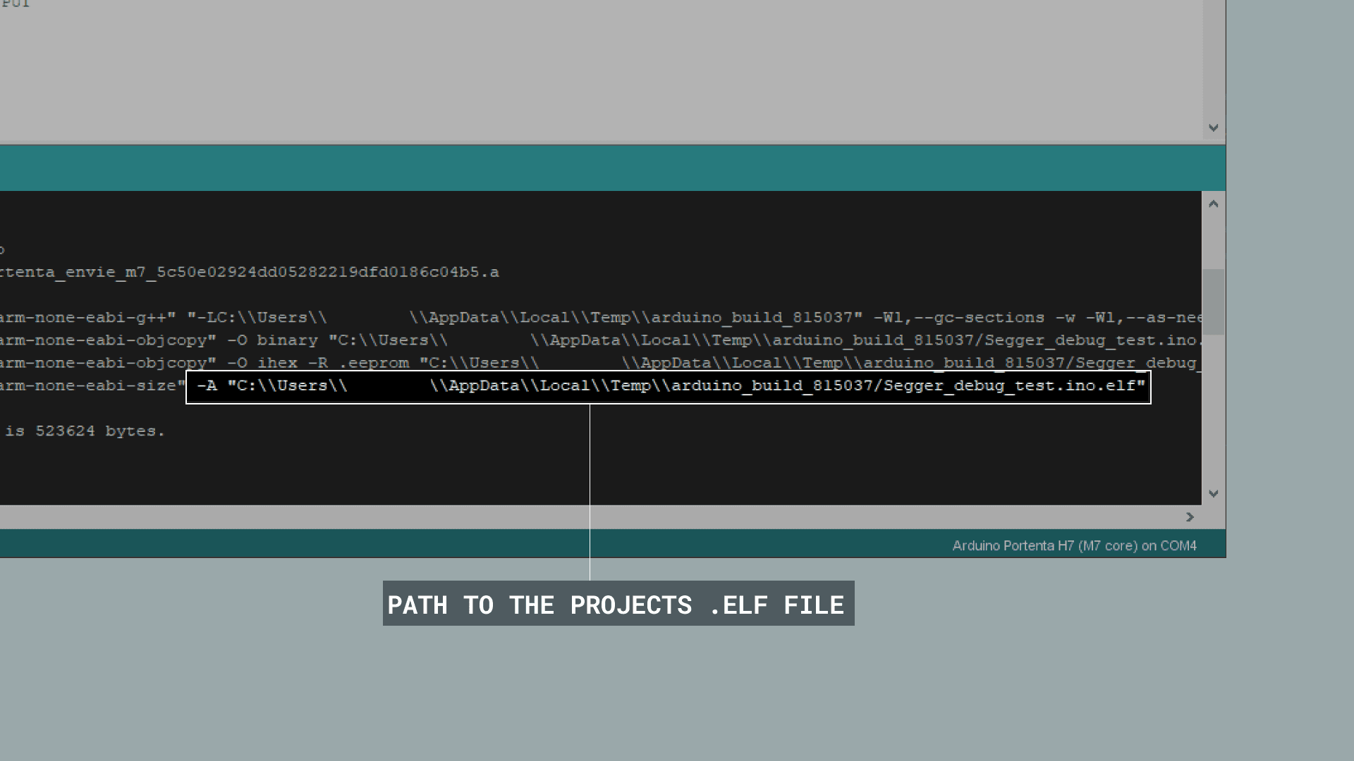 When we upload the sketch with the Arduino IDE, we need to know where the .ELF file will be saved. Build your project in the Arduino IDE and highlight the output directory; it should look for example like