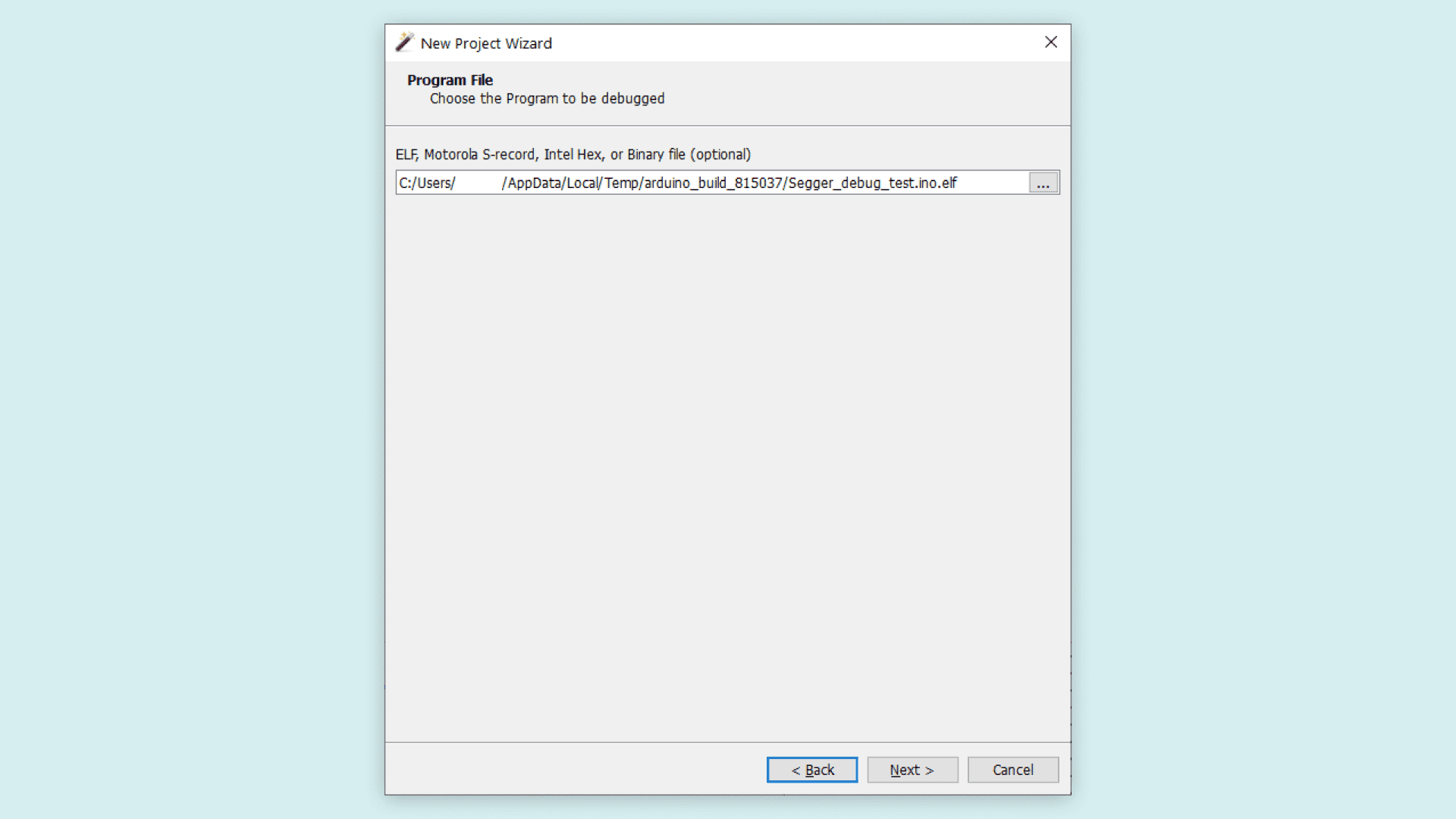 Now you get to the window that asks you to select the program to be debugged, this is where you load the project's .ELF file with the temporary output path that we noted before. Navigate to the correct directory, and select the .ELF file.