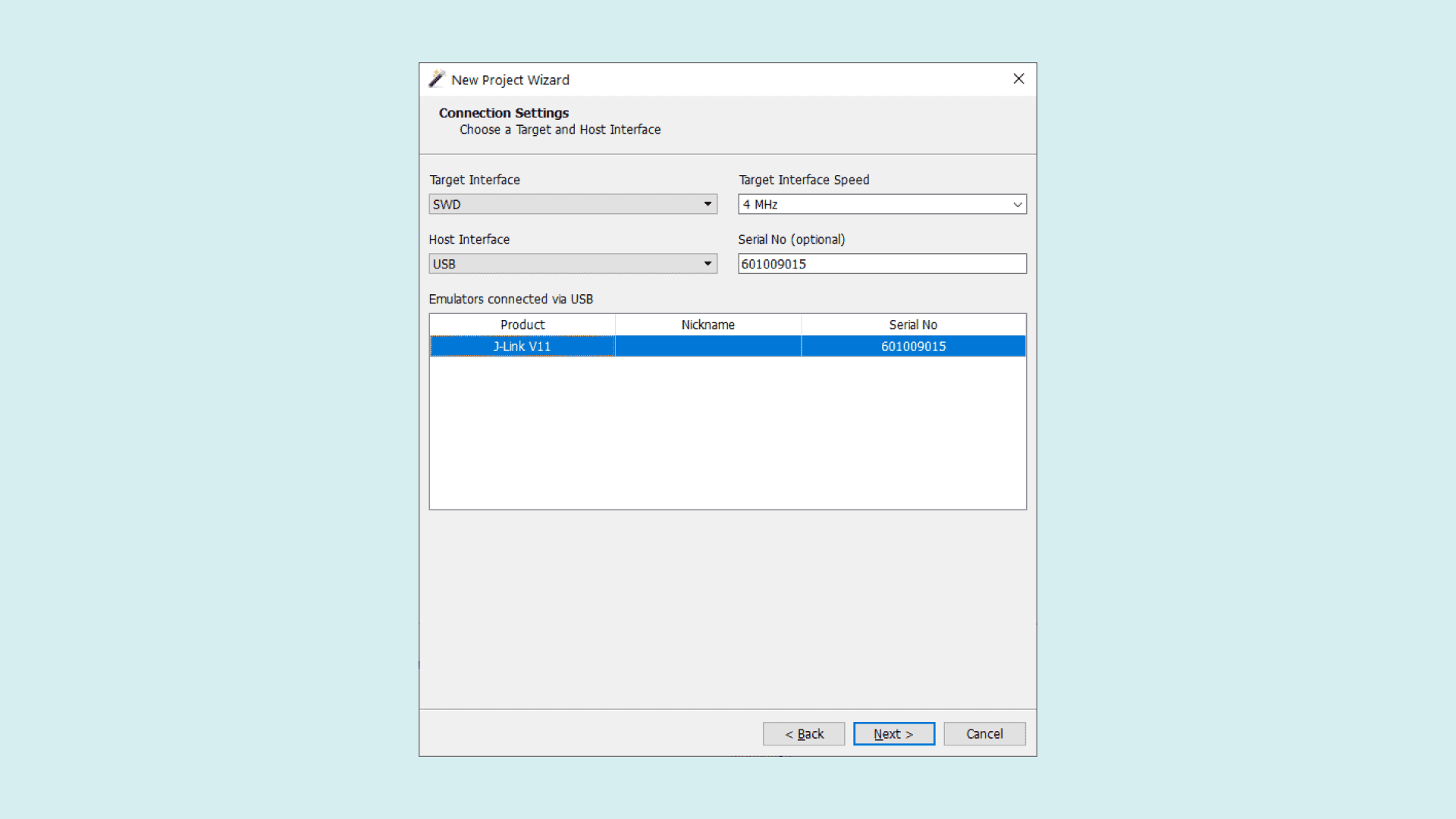 Continue to the next step. Here you need to change the Target Interface to SWD. The Portenta H7 does not support JTAG. Then select your J-link device in the list of emulators and head to the next page.