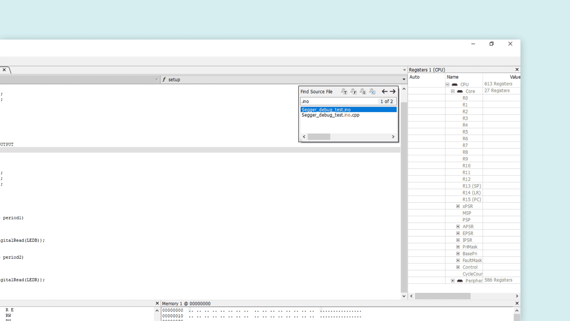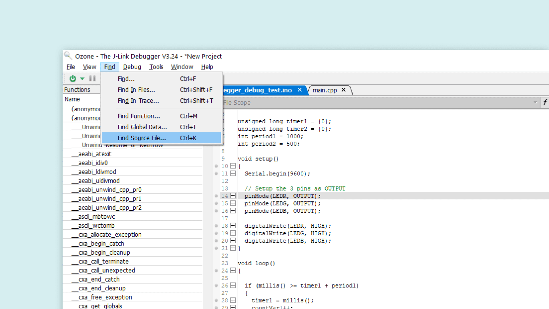 When the setup is finished, Ozone will open the file containing the main function. You will note that this is not the .ino sketch you wrote since this is an abstraction layer generated by the IDE. To open our .ino sketch we need to go to Find > Find source file in the top toolbar.