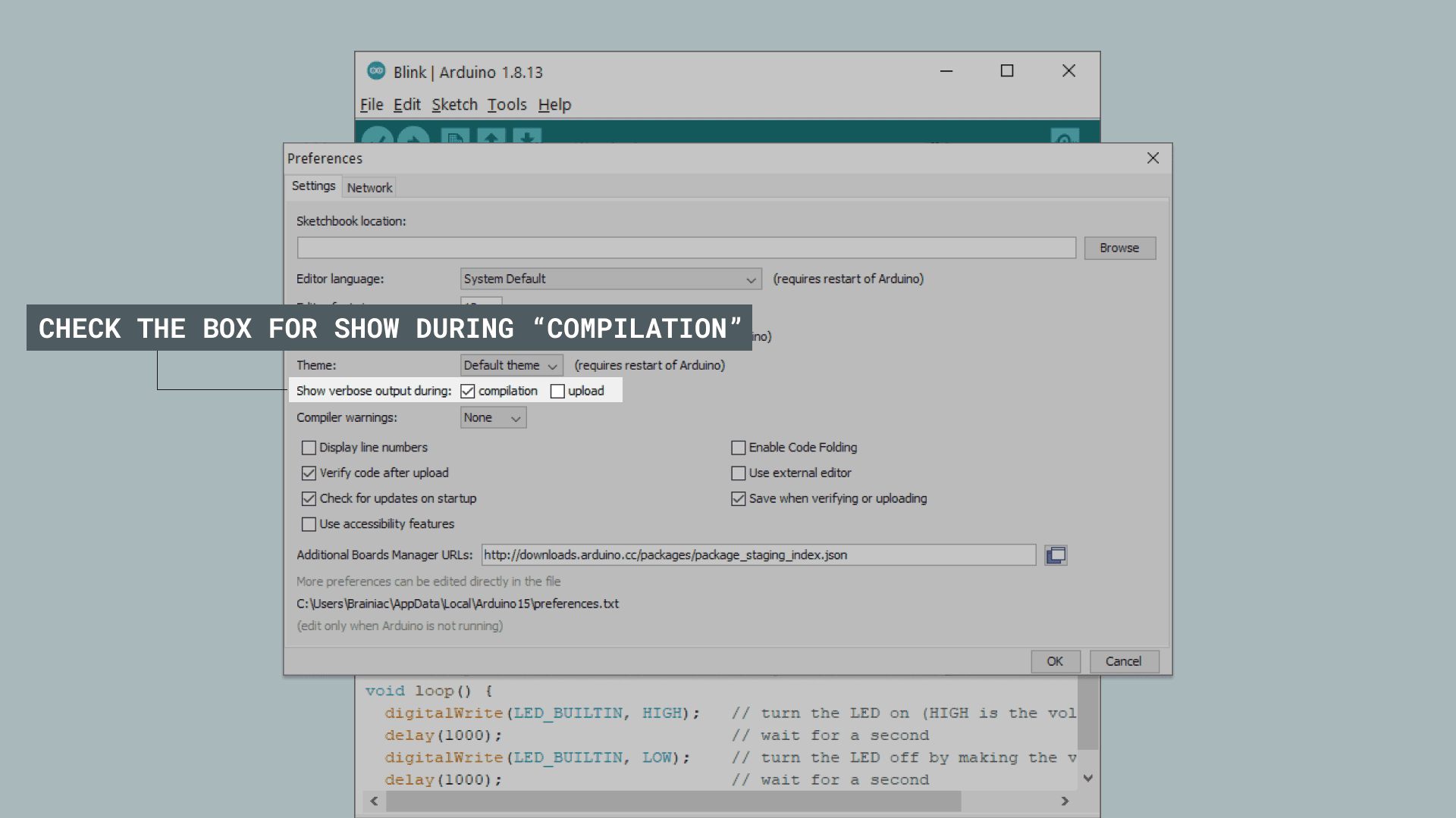 When you have the preferences window open, look for the Show verbose output during: compilation option and make sure that the checkbox is ticked.