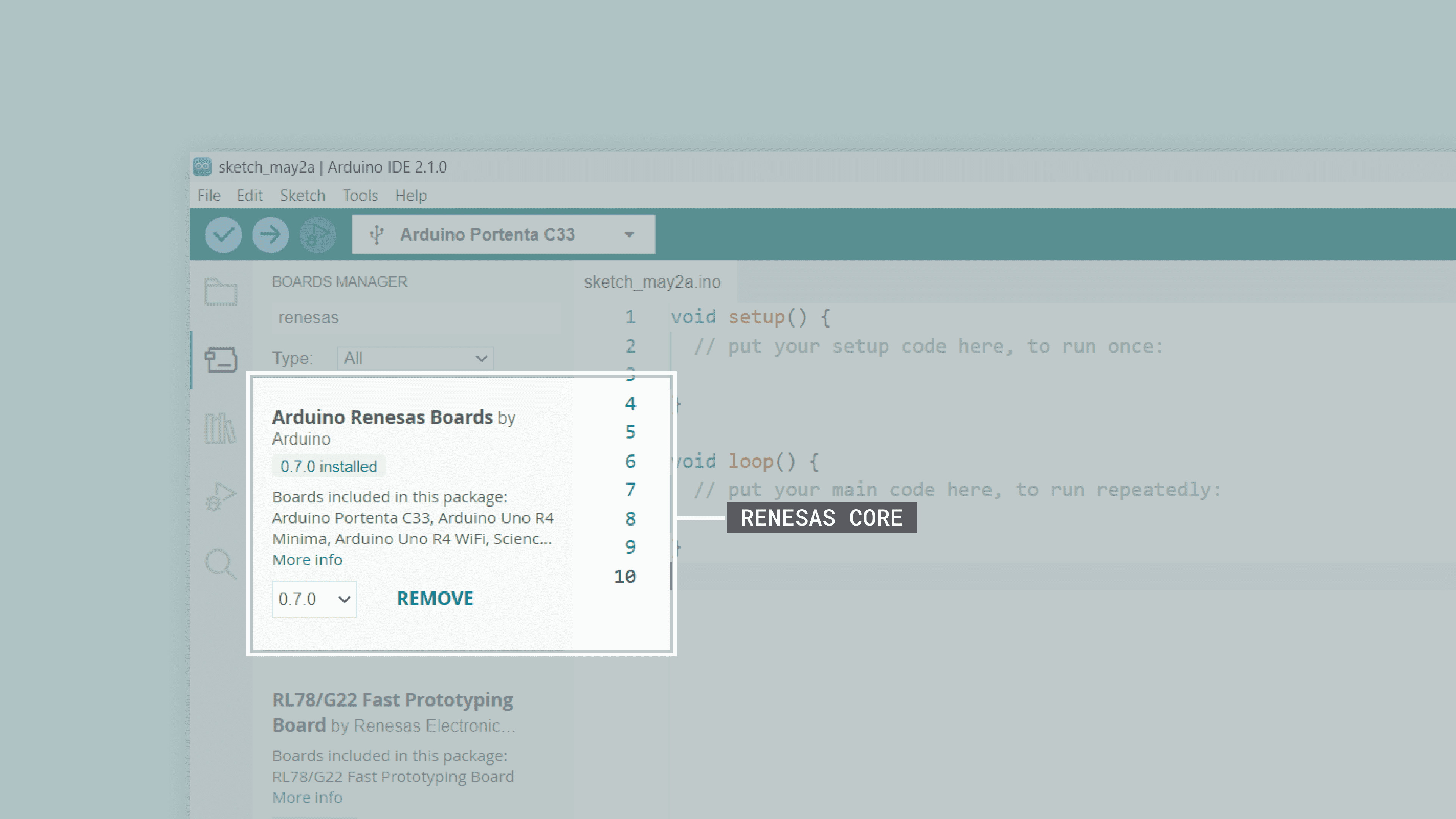 renesas and install the latest Arduino Renesas Boards version.