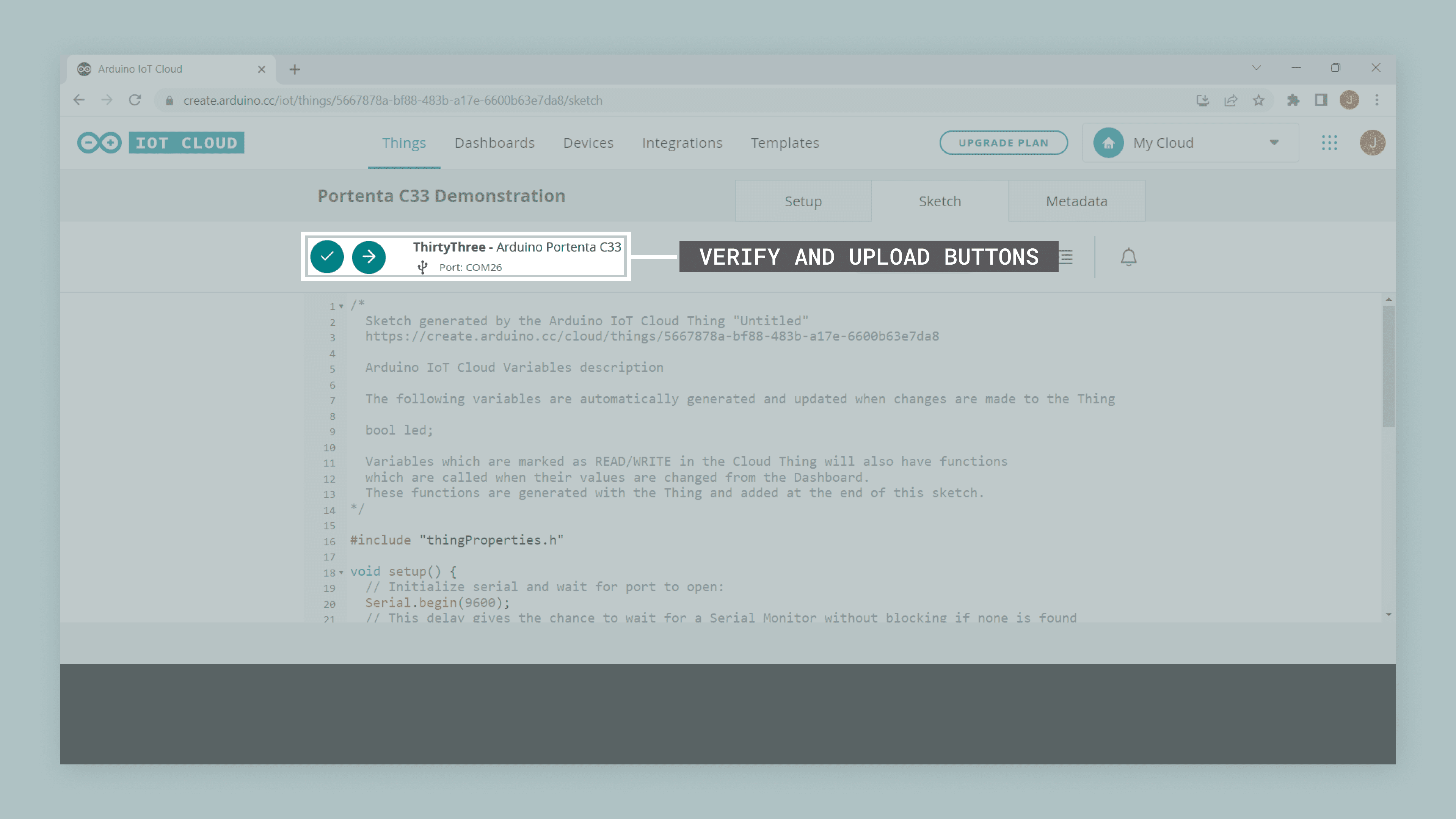 45/*46 Since Led is READ_WRITE variable, onLedChange() is47 executed every time a new value is received from IoT Cloud.48*/49void onLedChange() {50 digitalWrite(LED_BUILTIN, !led);51}To upload the code to the Portenta C33 from the online editor, click the green Verify button to compile the sketch and check for errors, then click the green Upload button to program the board with the sketch.