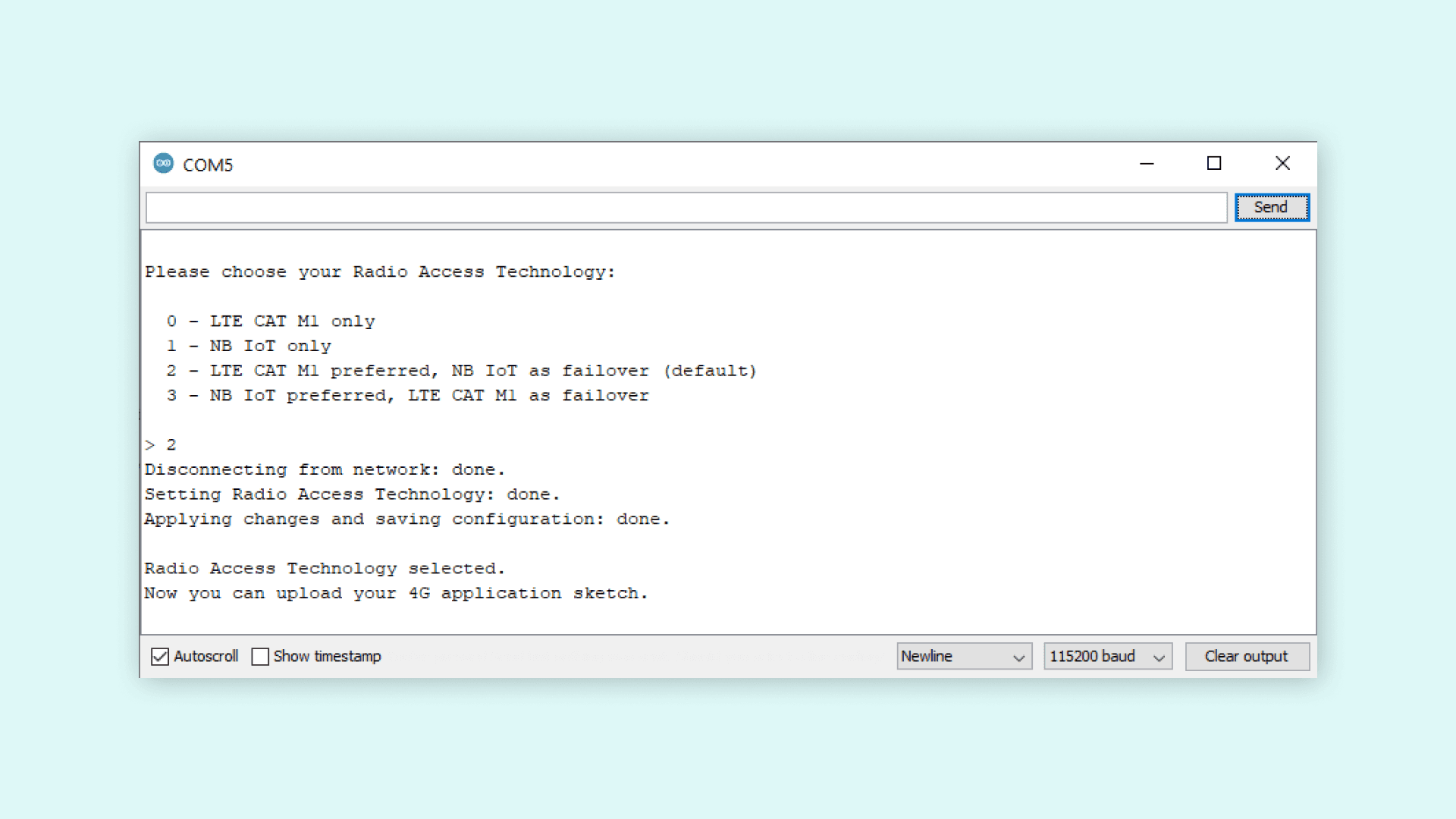 If you prefer to use one communication technology over the other, then this can be changed with the simple use of one sketch. Open the ChoseRadioAccessTechnology sketch located in the MKRNB examples. When this sketch is uploaded, open the serial monitor. You will now get options for what technology you prefer to use in the serial monitor. Follow the steps and wait for the sketch to say that it is finished. The board will now use the preferred technology and we can move on to upload other sketches.