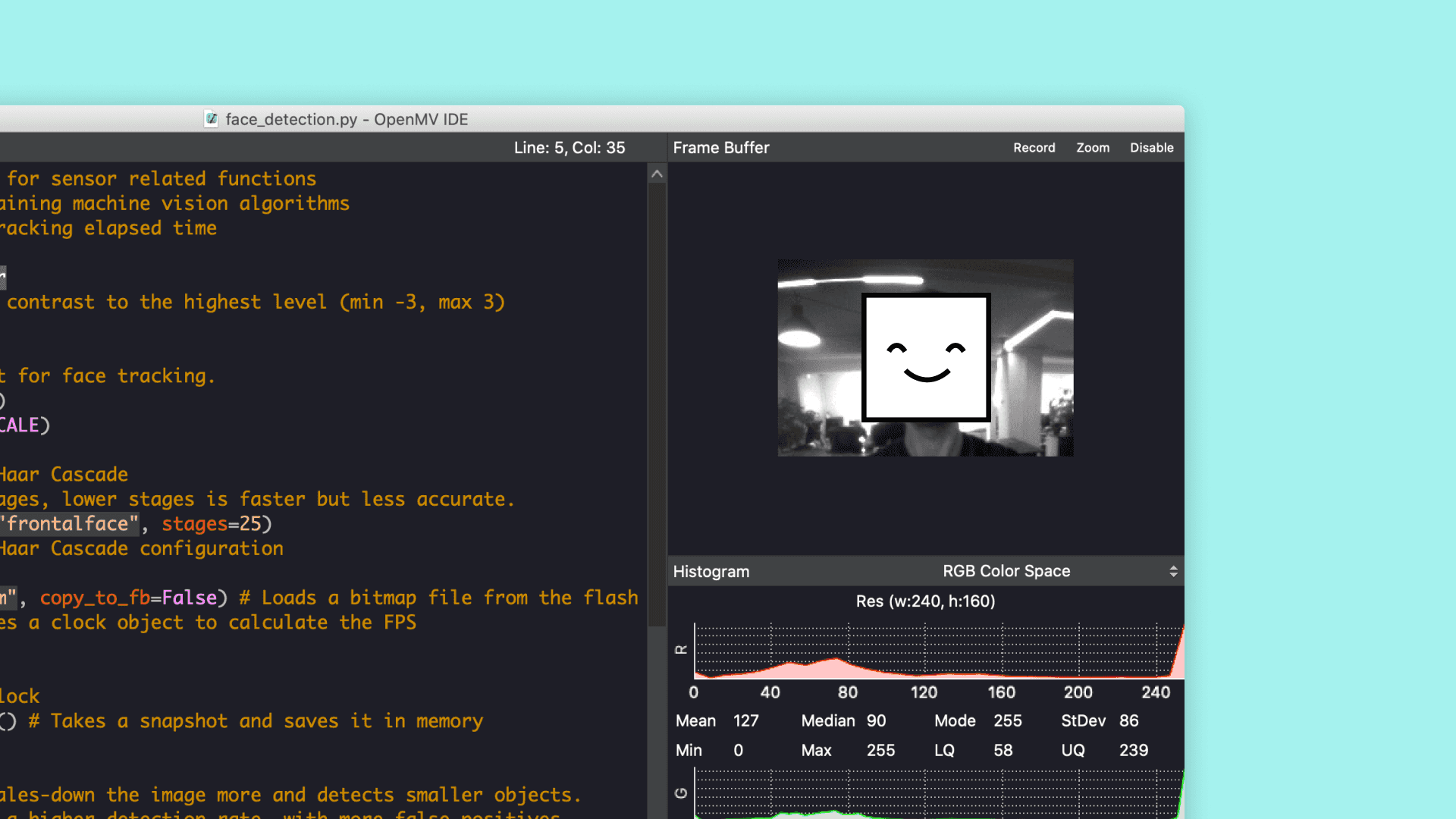 9# HQVGA and GRAYSCALE are the best for face tracking.10sensor.set_framesize(sensor.HQVGA)11sensor.set_pixformat(sensor.GRAYSCALE)12