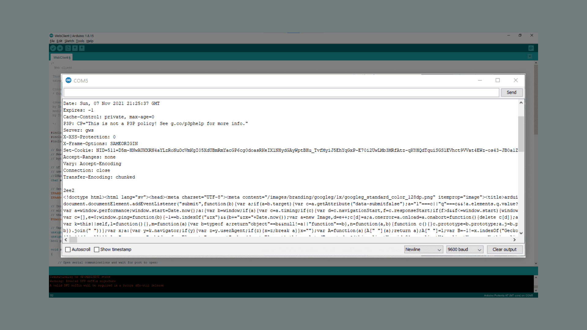 After uploading the sketch, open the Serial Monitor. The board will connect to a website. Then print the website content in the Serial Monitor. If everything went correctly, your Serial Monitor should look like the image below.