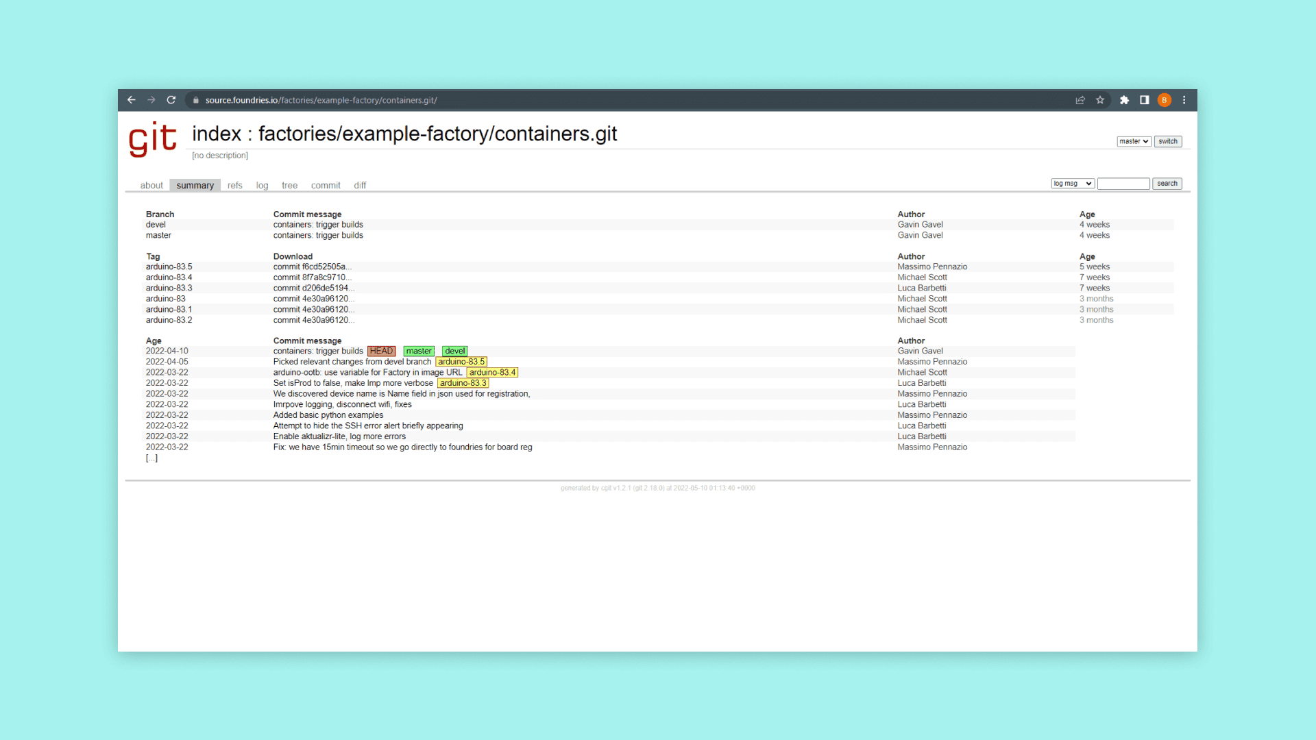 Once finished, we will push our folder to a repository within the Factory. Let us place our folder "x8-custom-test" inside the "containers.git" repository. You can find this repository inside your Factory page under "Source". Then, on "container.git", the page URL will be used in the following command.