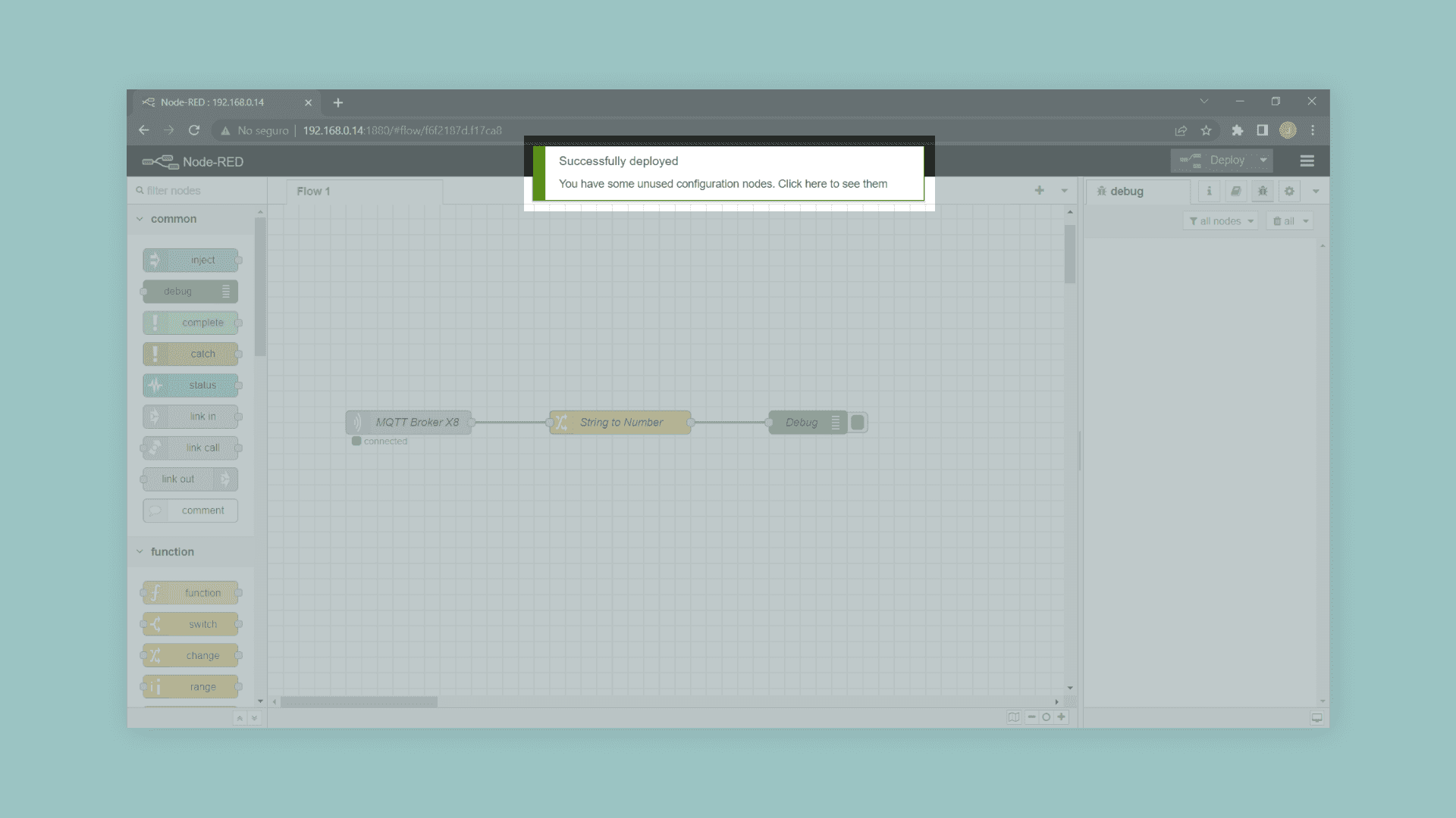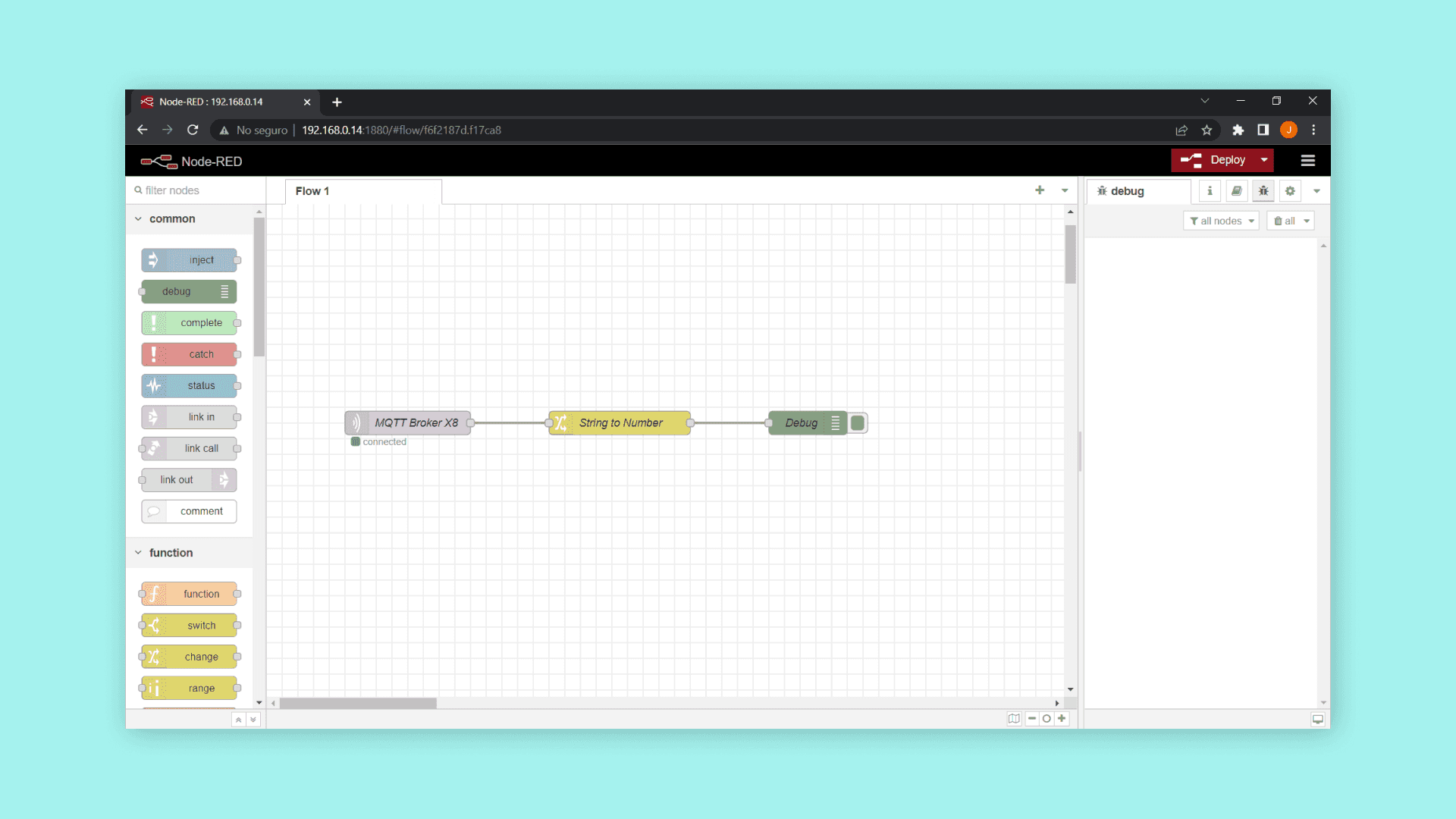 Let's use the MQTT client described before to test the MQTT broker integration with Node-RED. Just beneath the "Deploy" button, look for an icon with a bug; Node-RED's debug interface is open by clicking on the bug icon. Now we can start sending messages to the local MQTT broker in the X8 and see them deployed in the debug interface of Node-RED. With the MQTT client, let's subscribe first to the