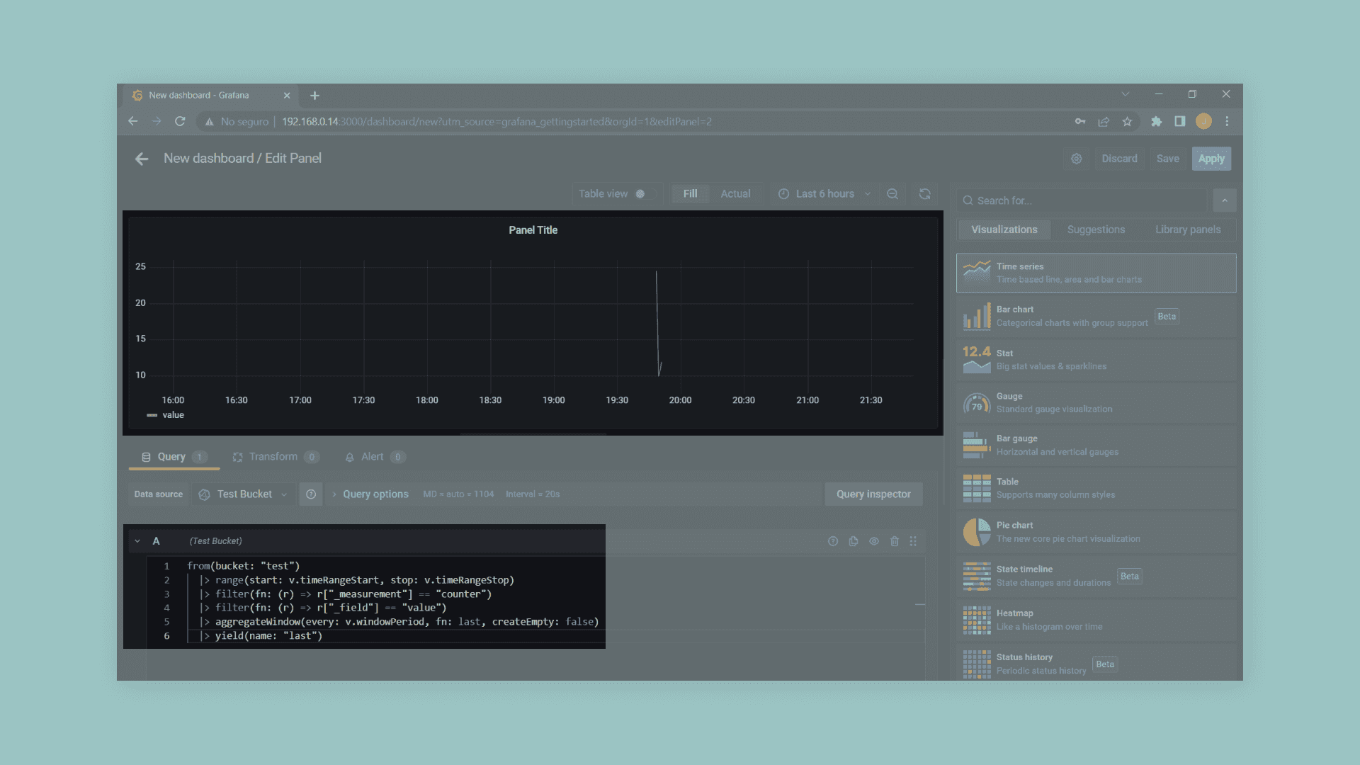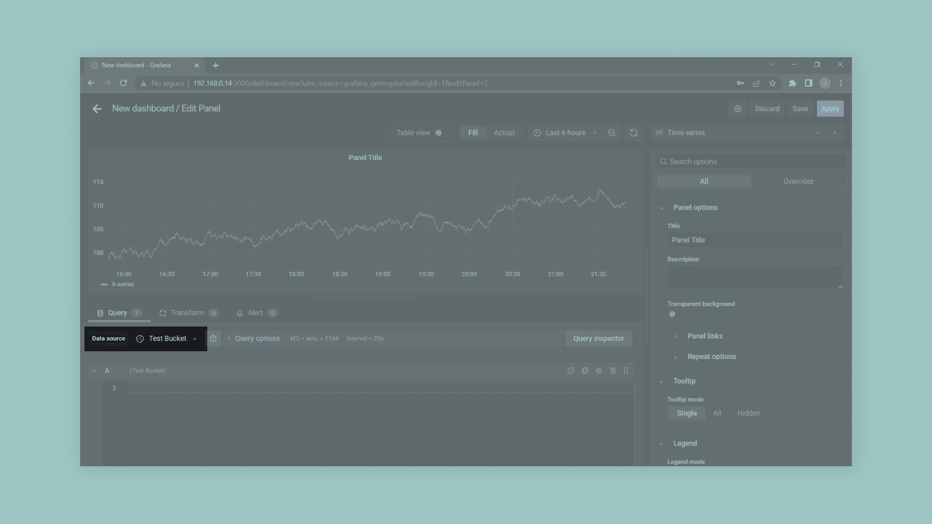 Now, in the Grafana GUI, create a new dashboard and add a new panel; in the configuration page, select as "Data source" the bucket we configured before,