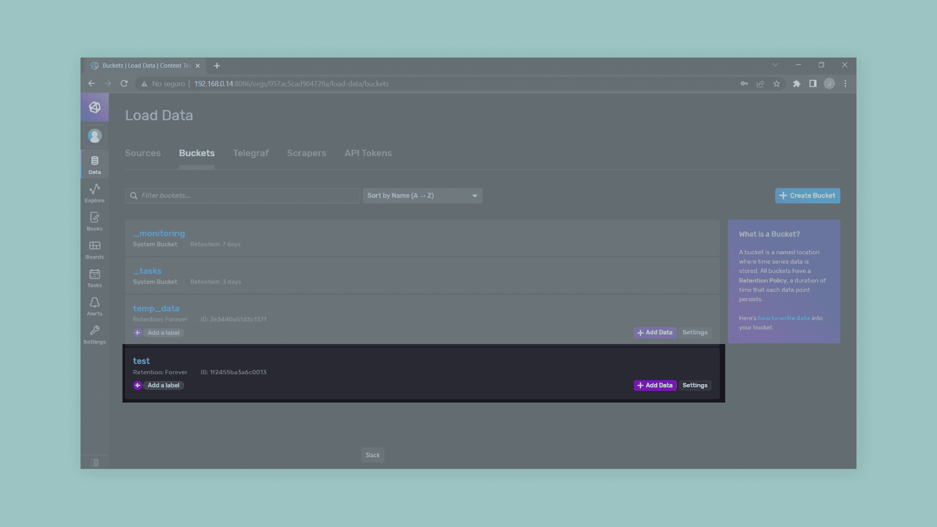 Select "Buckets" and click on the "Create Bucket" button. This will create a new database where data from the MQTT broker will be saved. For this example, let's create a new bucket called
