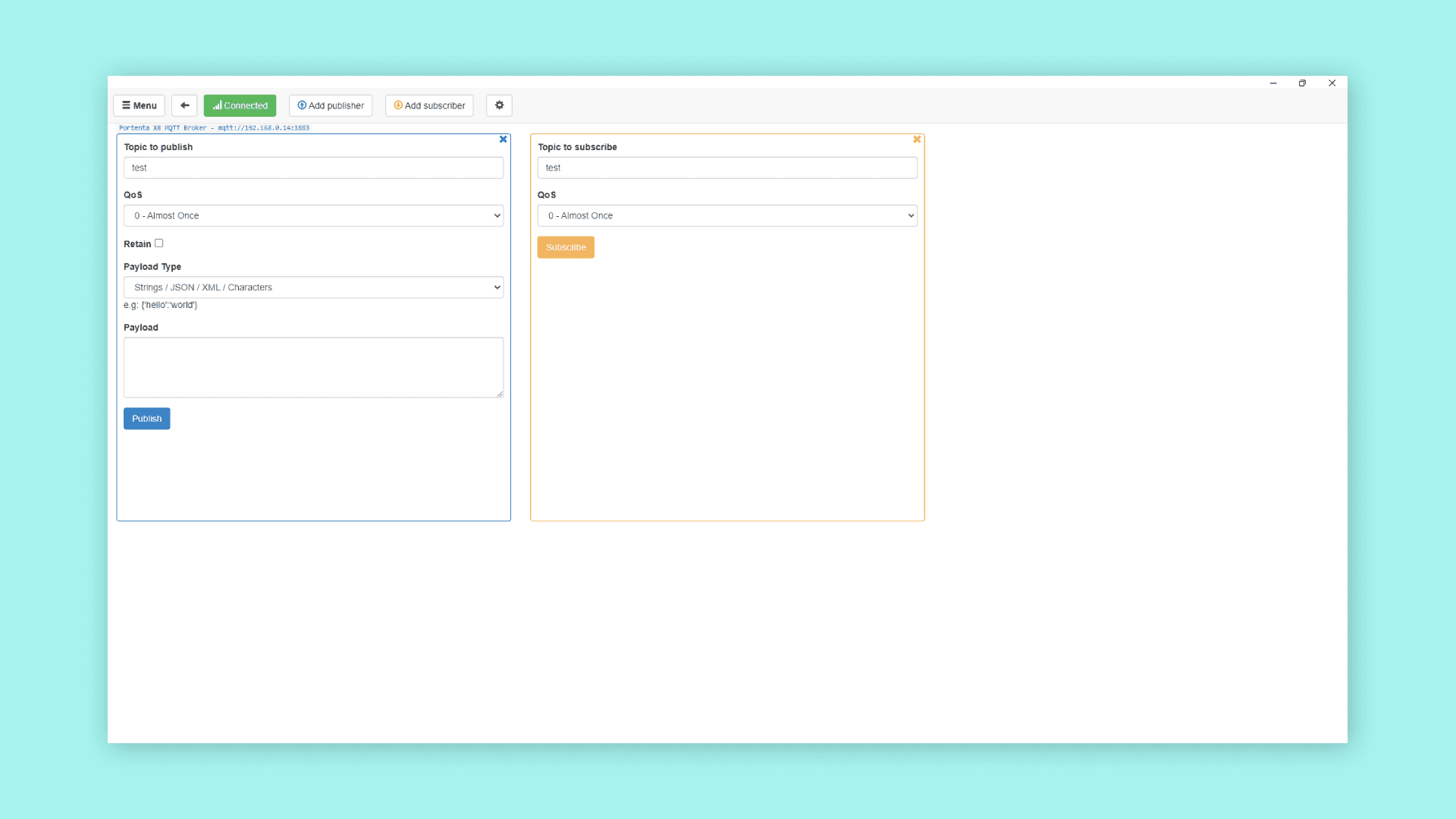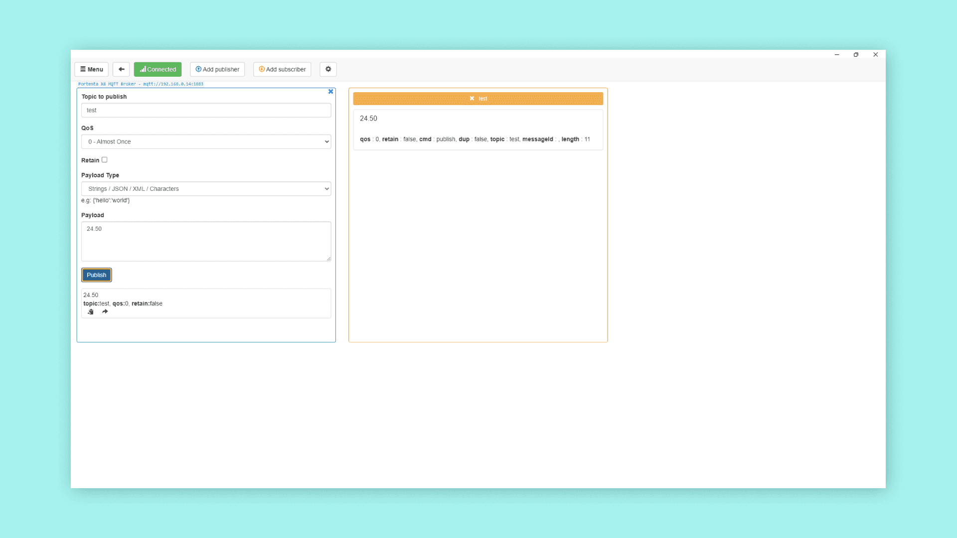 Leave everything else as default and save the settings of the client. If everything is ok, you should see now that the MQTT client connected with the local MQTT broker in our Portenta X8 board. Success! We can now start sending messages to the MQTT broker.