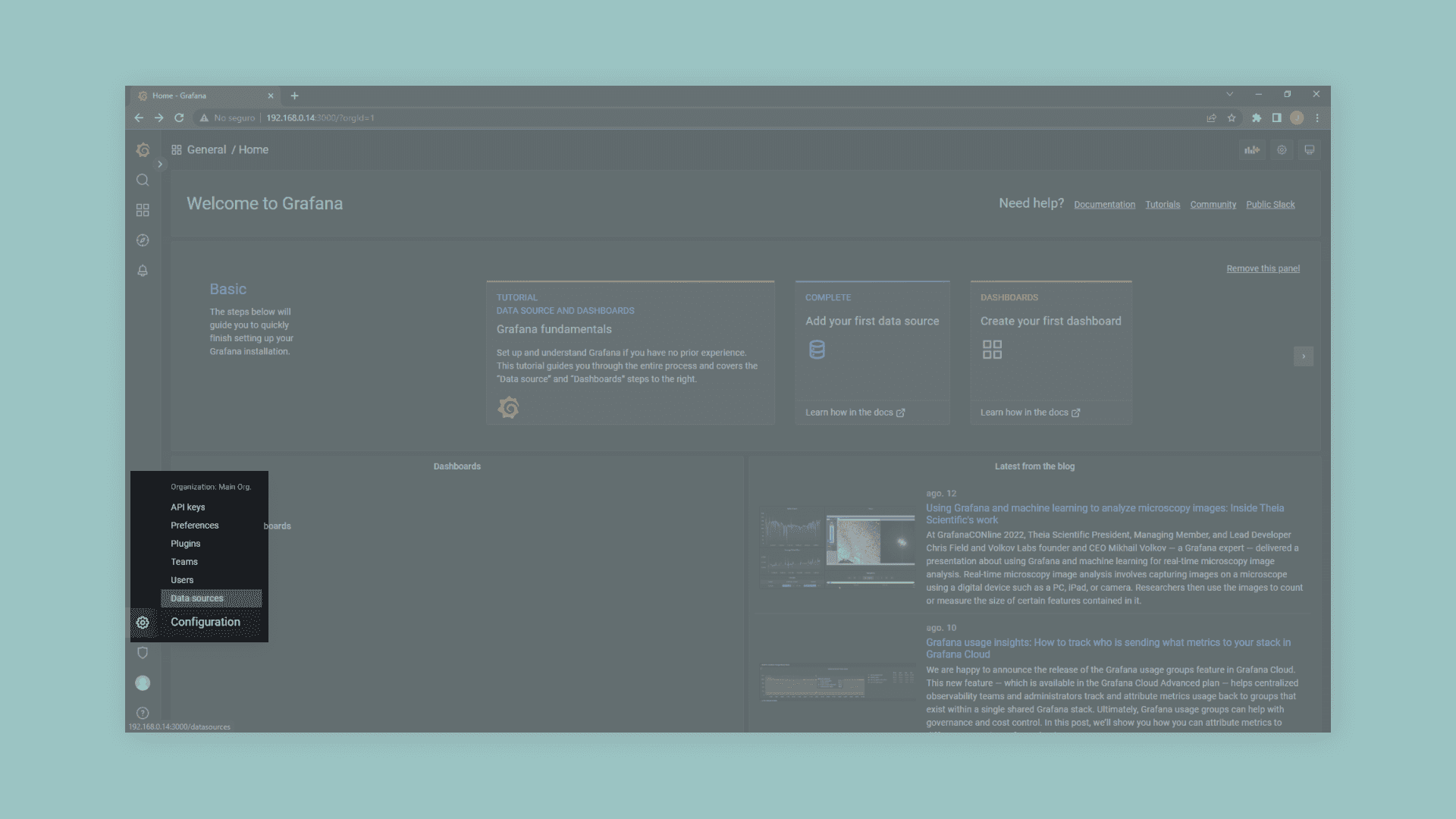 Before we can visualize data in Grafana, we must add a data source; we will add the InfluxDB bucket we created before as a data source. Select the cog icon on the side menu and then click on "Data Sources":
