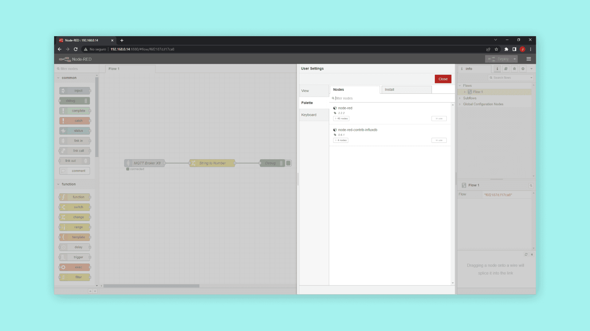 Nodes section located in the left part of the browser, search for network and choose the mqtt in node and drop it in the workspace; we will use this node to connect to the local MQTT broker of the X8. To change the node's properties, double-click on it and define the following properties:- Server: