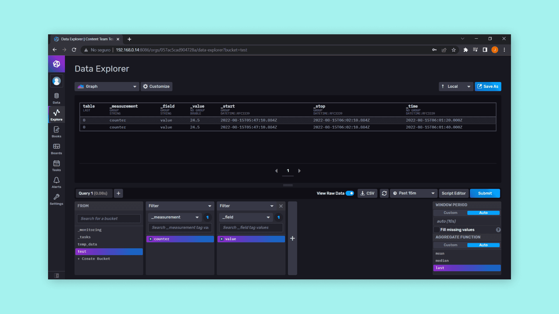 test bucket, then in _measurement select counter, in _field select value, and WINDOW PERIOD select last as shown in the image below: