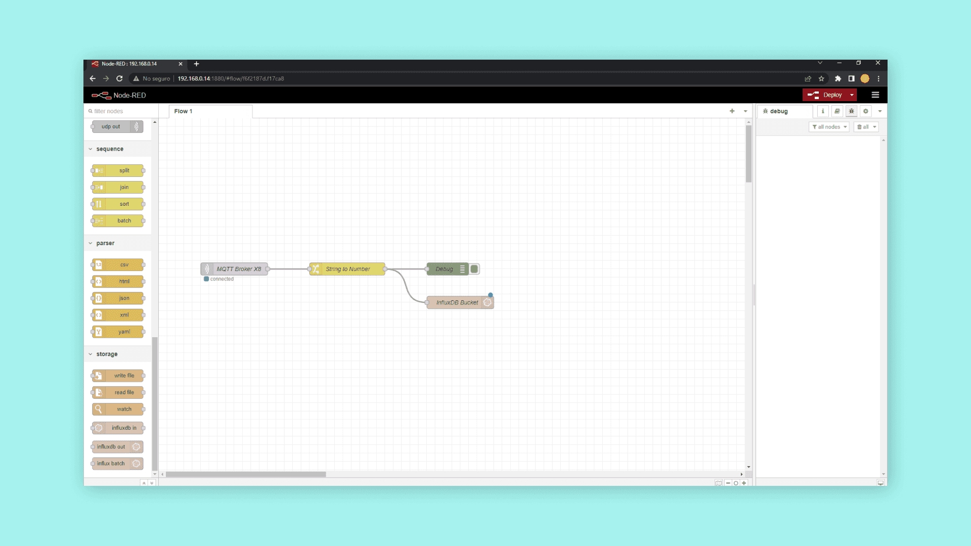 Let's use the MQTT client described before to test the MQTT broker integration with Node-RED and InfluxDB. Remember to first deploy the flow in Node-RED and subscribe to the