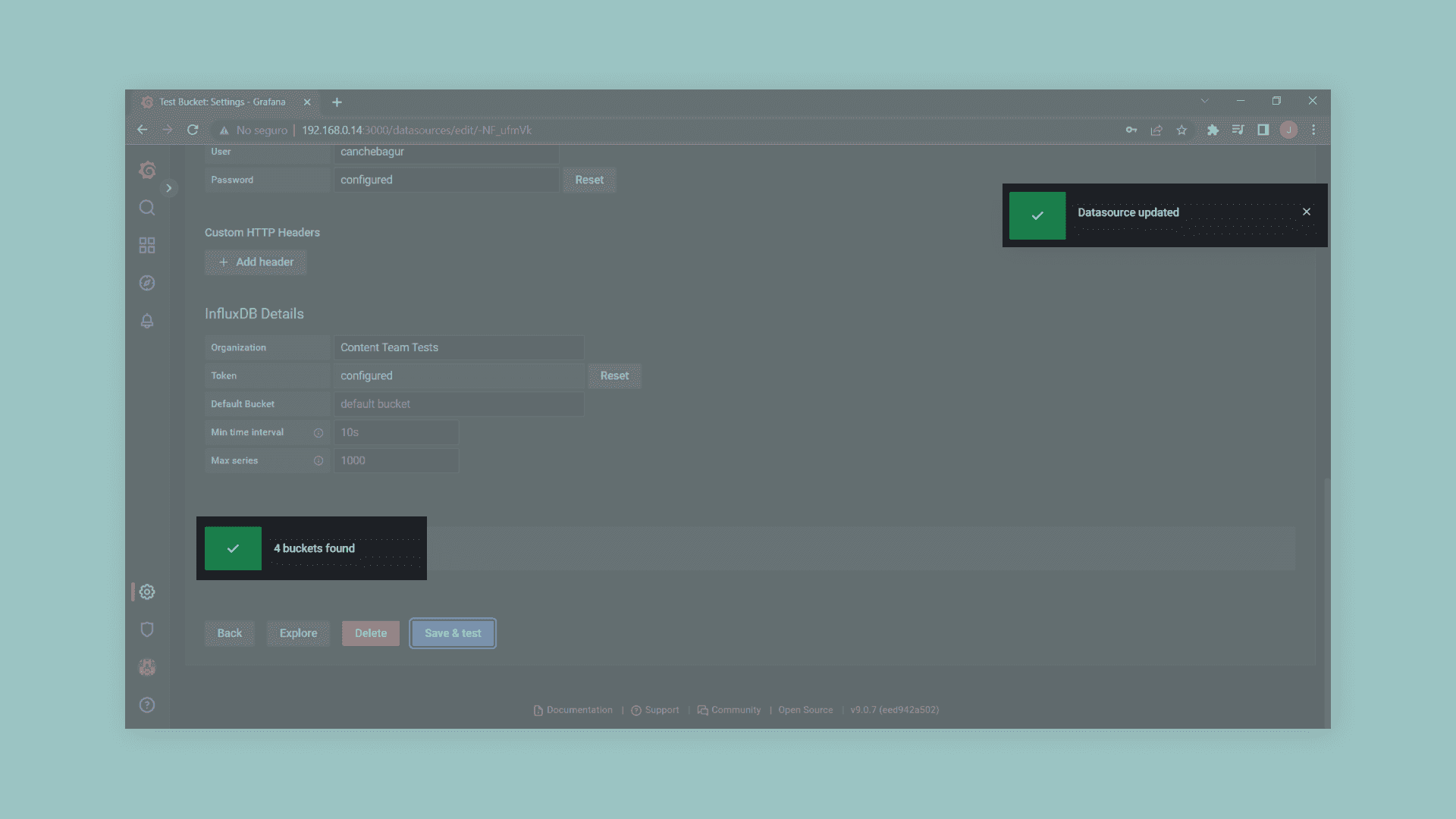 In the configuration page, enter the following information related to the data bucket we created before on InfluxDB: