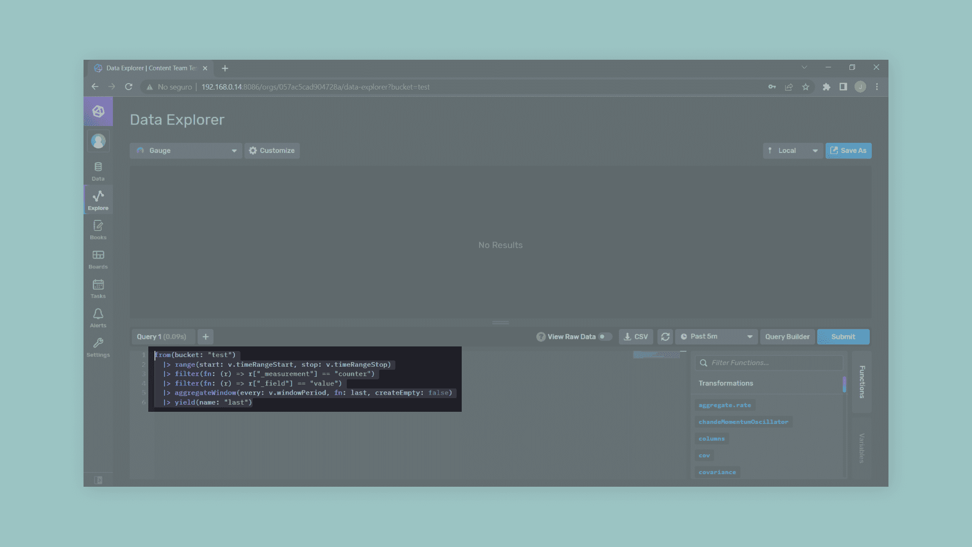 Now, let's go to the InfluxDB desktop. Go to "Data" and select the test bucket we created before; in the bucket data explorer, in the query editor, select the