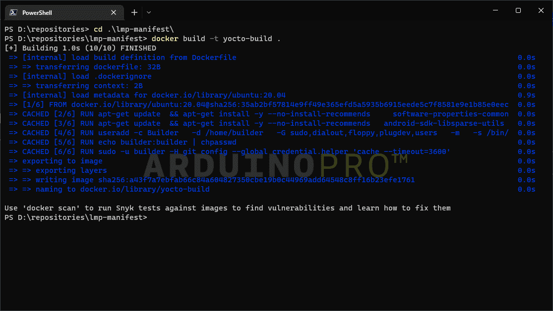 1cd lmp-manifest2docker build -t yocto-build ./lmp-manifestYou will be able to see similar result if everything went successfully.