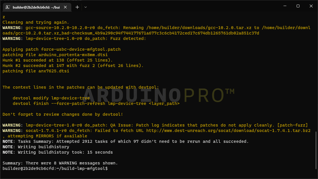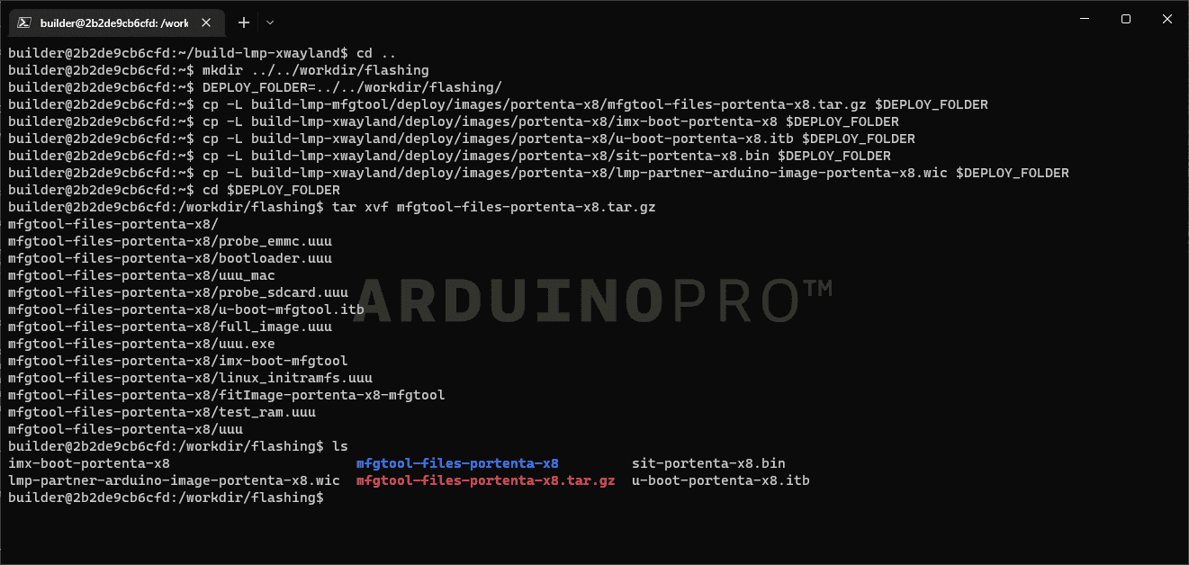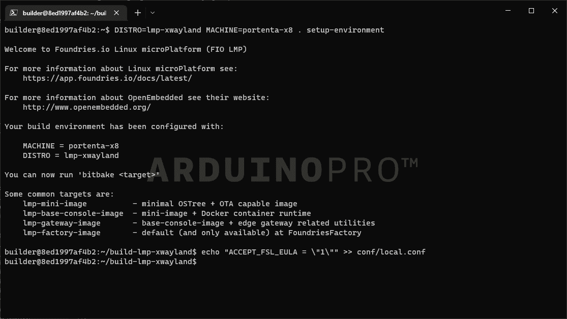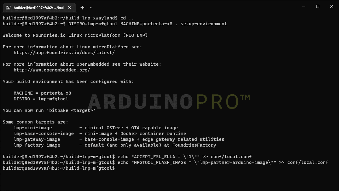 DISTRO following the command sequence:1cd ..2DISTRO=lmp-mfgtool MACHINE=portenta-x8 . setup-environment3echo "ACCEPT_FSL_EULA = \"1\"" >> conf/local.conf4echo "MFGTOOL_FLASH_IMAGE = \"lmp-partner-arduino-image\"" >> conf/local.confYou should be able to see similar results as following image when successful: