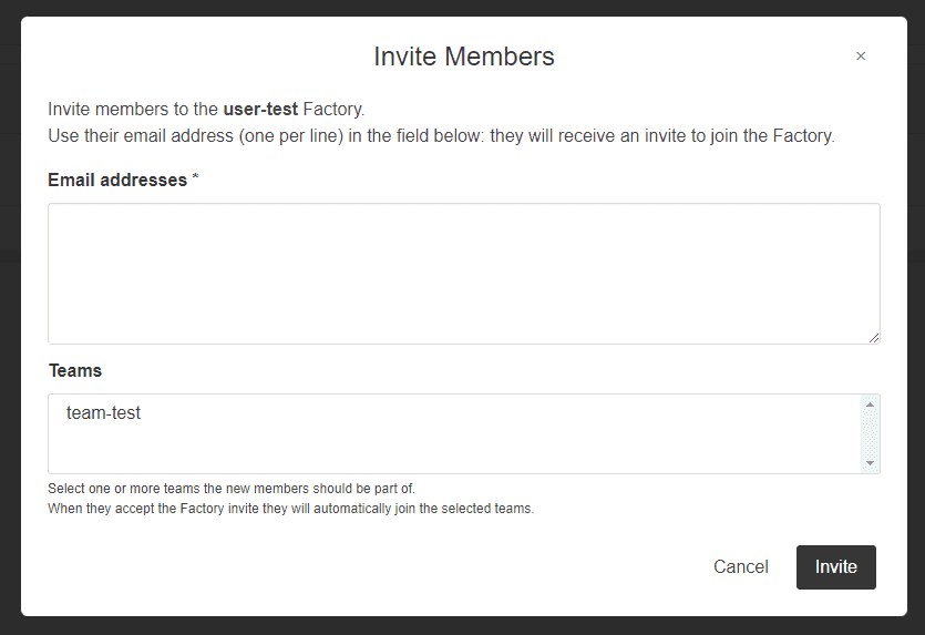 You can type the email addresses of your teammates and they will receive an automatic email with the invitation to join the corresponding team in your FoundriesFactory.