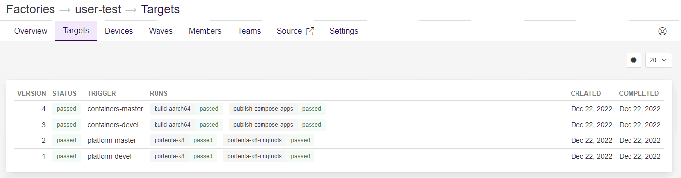 Committing to lmp-manifest.git or meta-subscriber-overrides.git repositories will create a platform Target, i.e. base Linux platform image. On the other hand, committing to containers.git will create a container Target including all the containers and docker-compose apps you would like to upload on your Portenta X8. Both these Targets will generate the artifacts specified in the ci-scripts.git, which includes all the required files to program the Target in case of platform build.