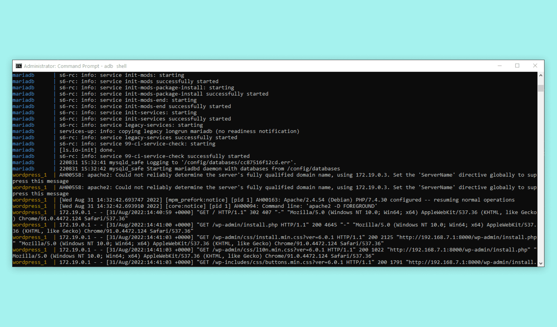 <uuid> with your Portenta X8's unique id and the port chosen for the WordPress container with <port>. The <uuid> can be found on the setup page that is shown in the User Manual's Out-of-the-Box Experience, but you can also get it in the terminal when running adb or you can go to http://192.168.7.1:8000 if you use Windows and Linux, on MacOS use http://192.168.8.1:8000.When you connect, you should get some feedback in the terminal. Text will begin printing in the terminal, showing you information about the connection that has just been established as shown in the image below.