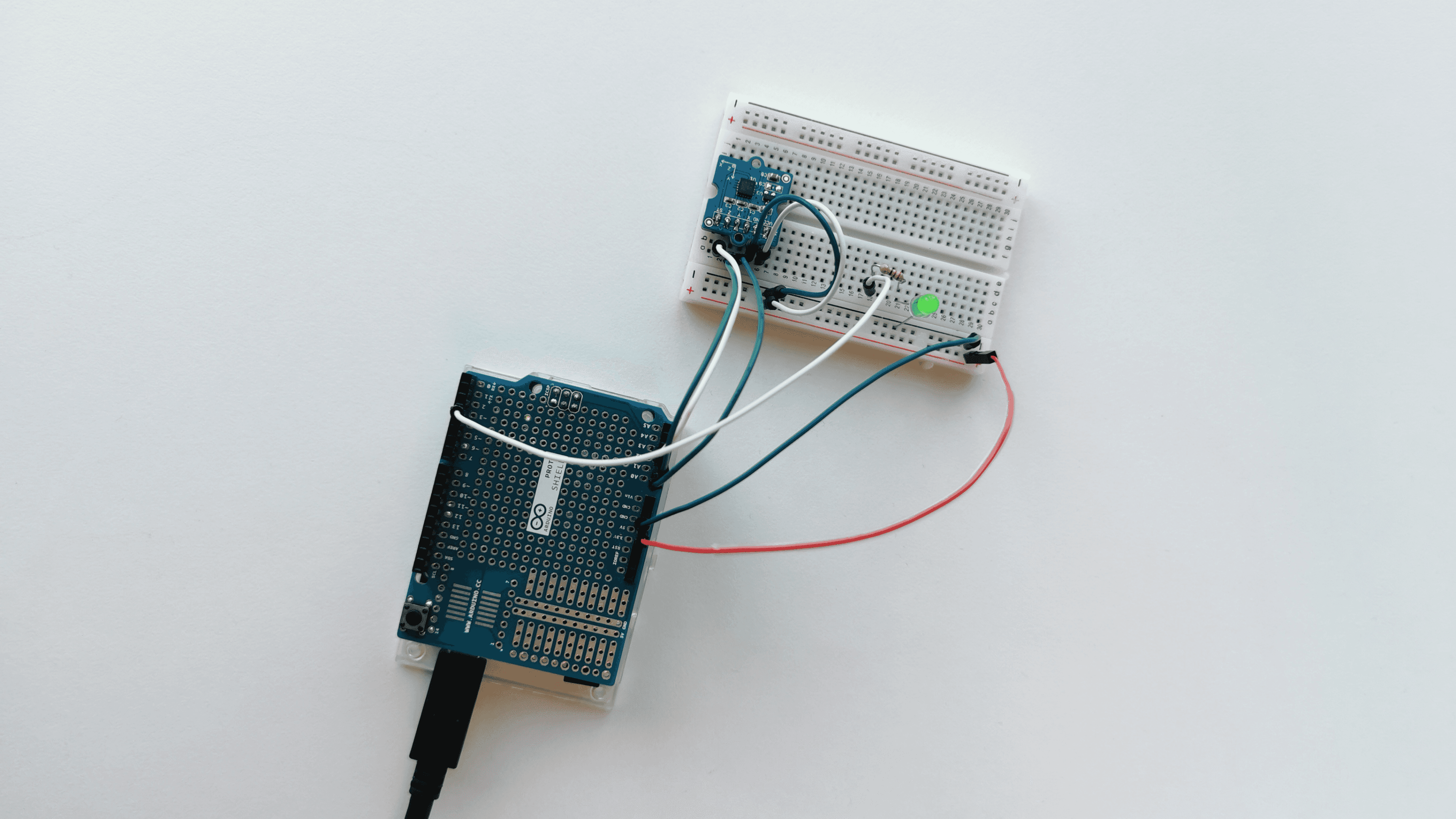 Now it's time to put your components onto your shield. But before you get all excited and start soldering everything onto your shield we highly recommend prototyping and testing your circuit on a breadboard, making sure everything works as expected.