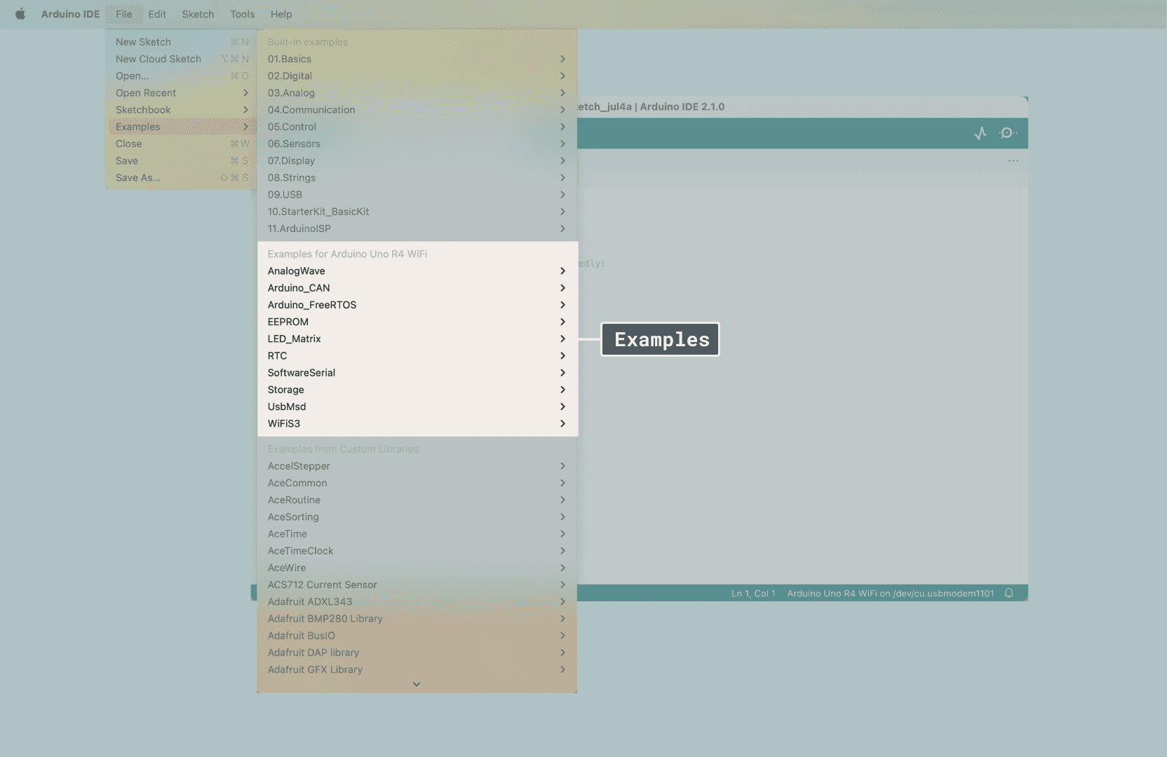 There are several examples available for the UNO R4 WiFi board, which can be accessed directly in the IDE, through File > Examples. These examples can be used directly without external libraries.