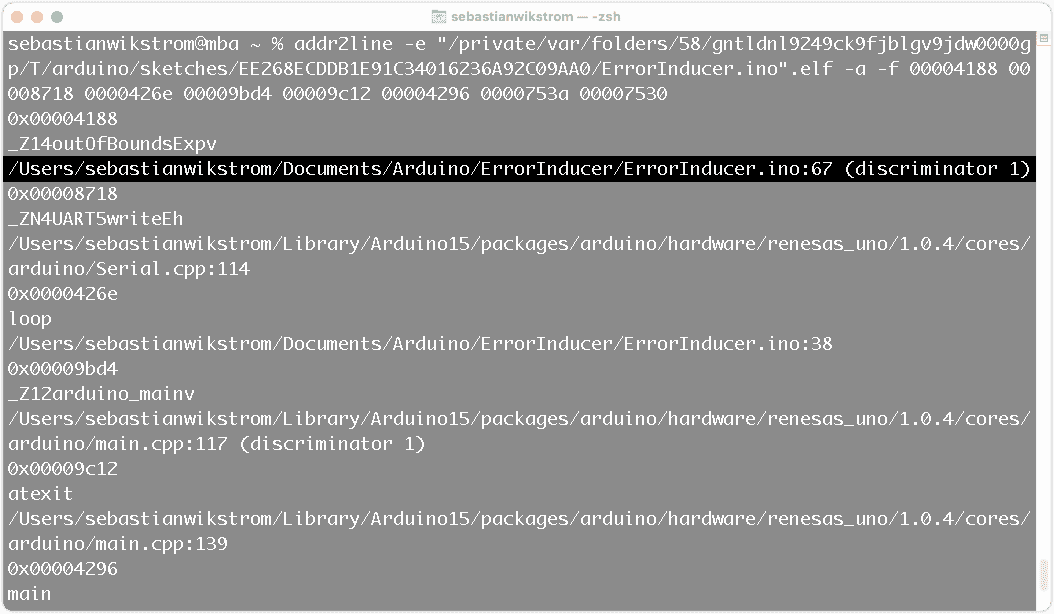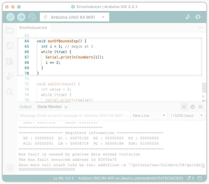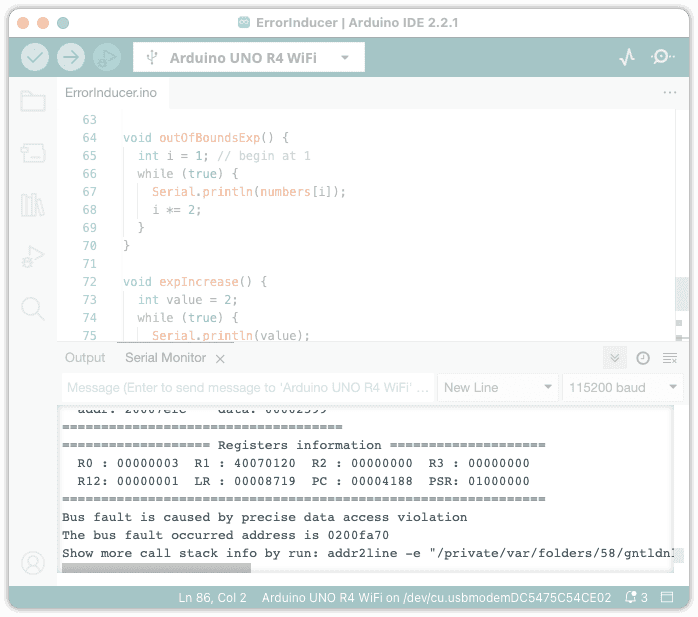 The Arduino UNO R4 WiFi uses CmBacktrace to print useful information from the Arm Cortex-M4 processor as serial output when a runtime error occurs. The output includes an