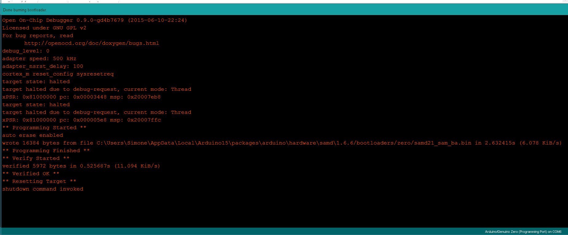 If all the settings of the Arduino Software (IDE) are as described above, you may go ahead and update the bootloader of your Zero Board. Go to Tools > Burn Bootloader and wait until you get on the status line the Done burning bootloader message.
